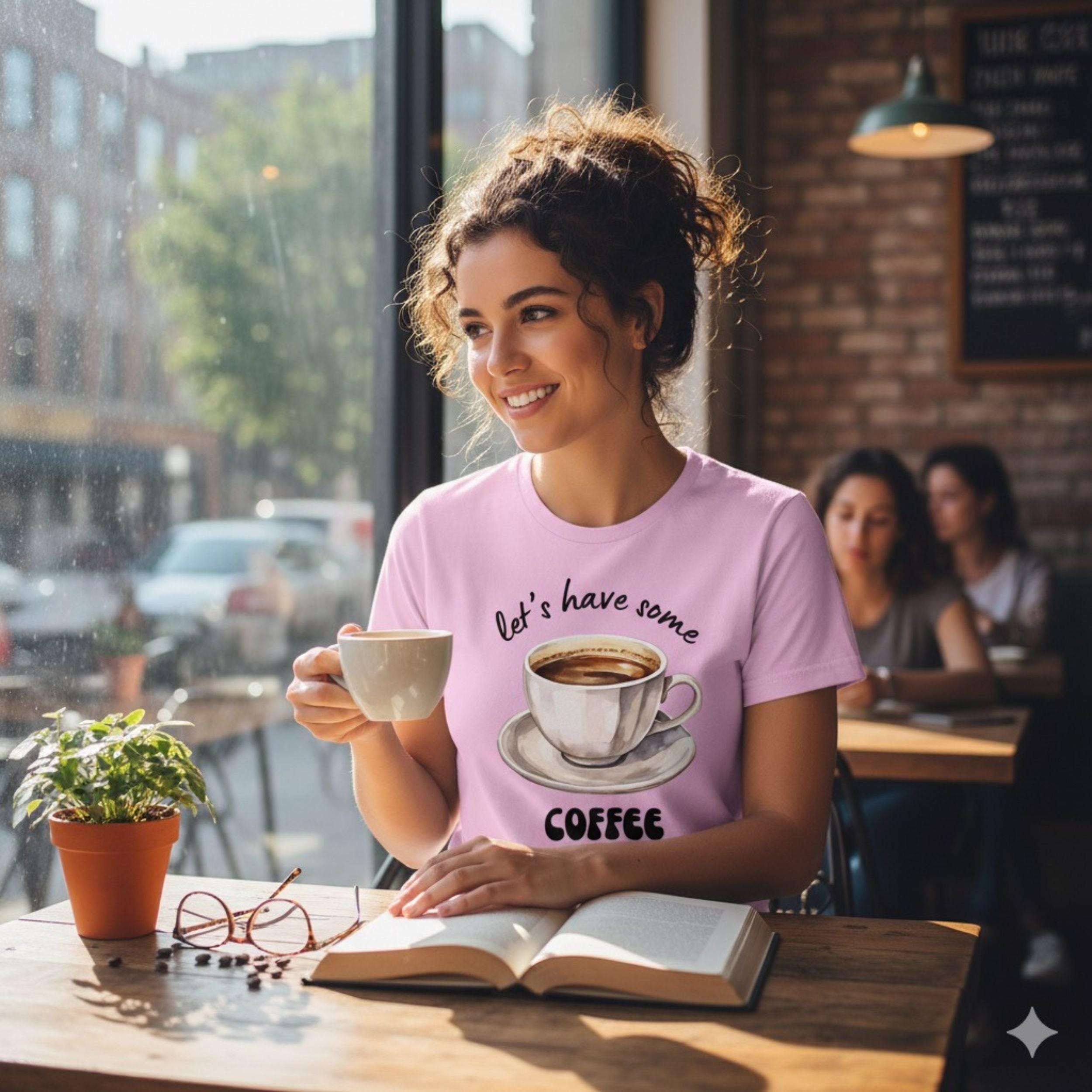 Start your day with the perfect expression of your caffeine love — the Coffee Lover Tee. This funny coffee T-shirt for caffeine addicts is designed to showcase your morning vibes and coffee obsession in style. Featuring the playful quote "Let's Have Some Coffee" alongside a charming coffee cup illustration, this coffee quote shirt is a fun way to share your love for that first brew of the day.