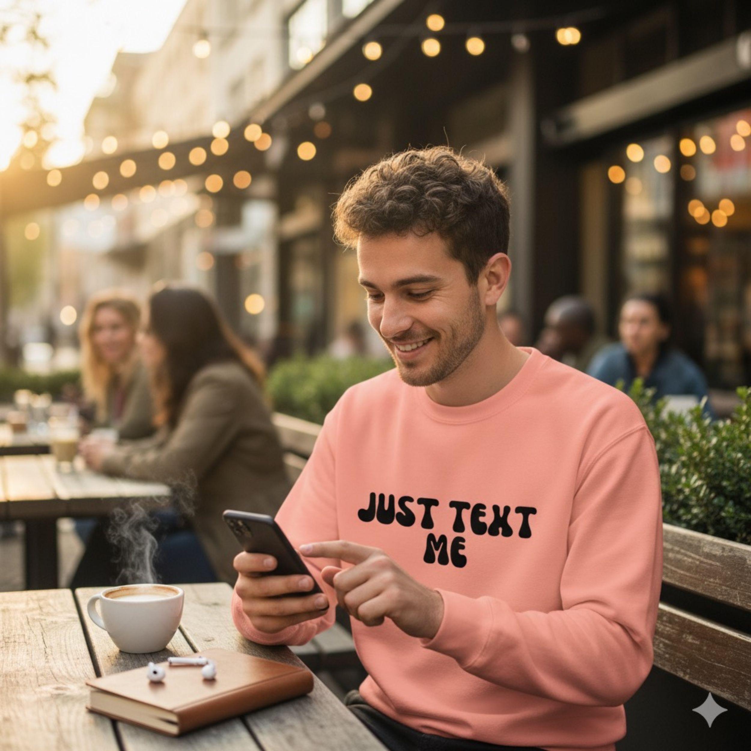 Upgrade your wardrobe with our "Just Text Me" sweatshirt today and add a touch of humor and style to your daily outfits. Whether you're treating yourself or looking for a unique gift for a loved one, this trendy aesthetic pullover is sure to impress. Don't miss out on this must-have piece for your closet.