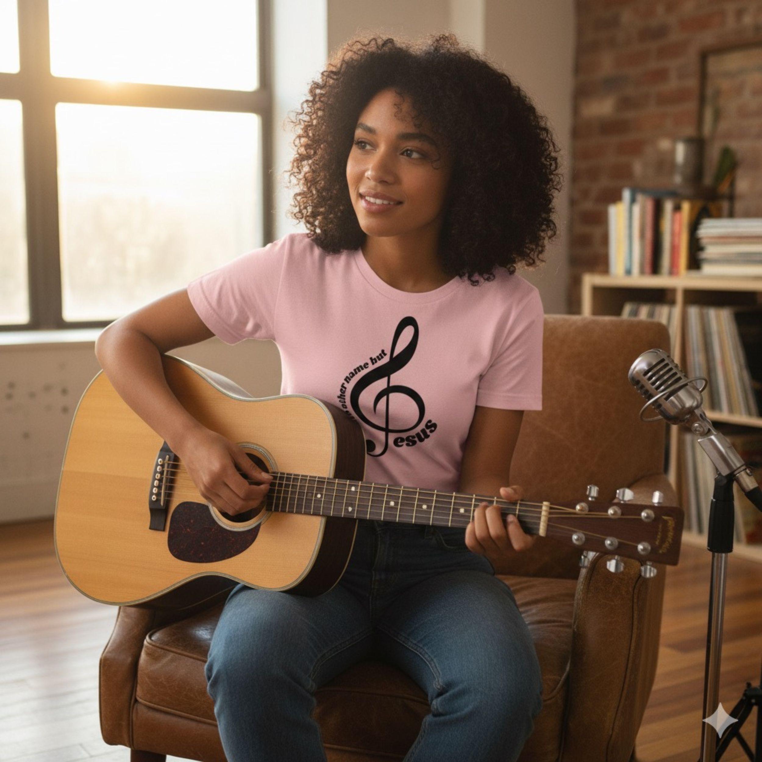 Designed for both men and women, this unisex tee offers a relaxed fit and high-quality fabric that feels soft against the skin. Its eye-catching graphic showcases a large treble clef intertwined with the words "no other name but Jesus," making it a meaningful addition to your Christian apparel collection.