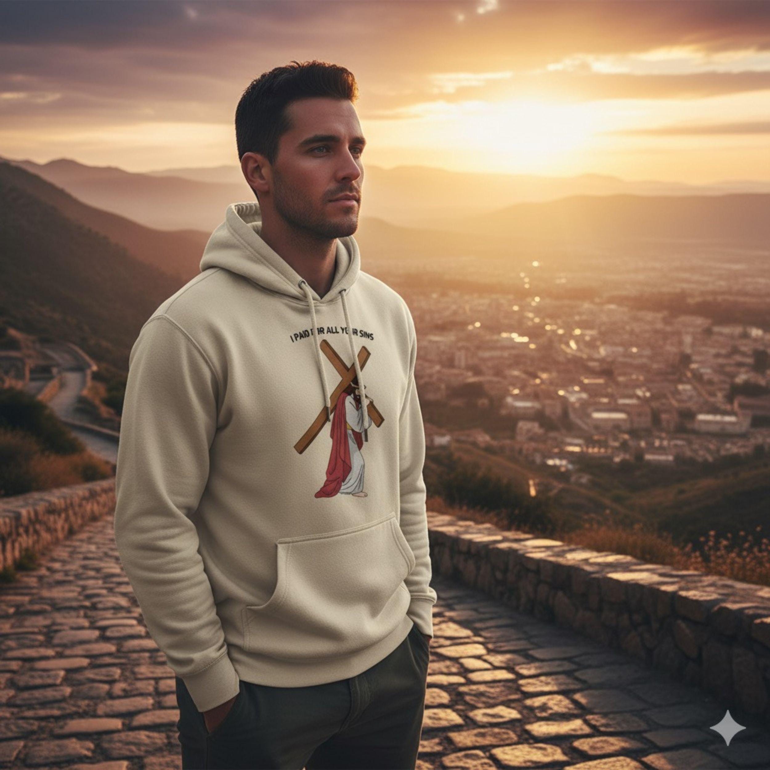 Made from a soft cotton-blend fleece, this gospel hoodie offers the ideal balance of warmth and breathability, ensuring you'll stay comfortable no matter the occasion. Its eye-catching Jesus cross graphic, paired with the inspiring phrase "I Paid for All Your Sins," makes it a meaningful addition to your Christian wardrobe. The subtle yet powerful design sparks conversations about faith and grace wherever you go.