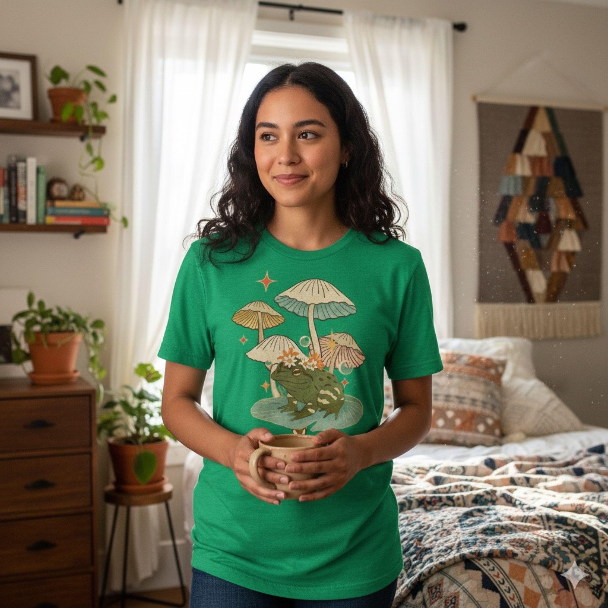 Designed for frog lovers, cottagecore fans, and mushroom admirers, this tee brings forest fantasy to life in a soft, breathable fit you’ll want to wear every day. Whether you're hiking through nature, browsing farmers markets, or chilling with your terrarium friends, this shirt is your new favorite companion.