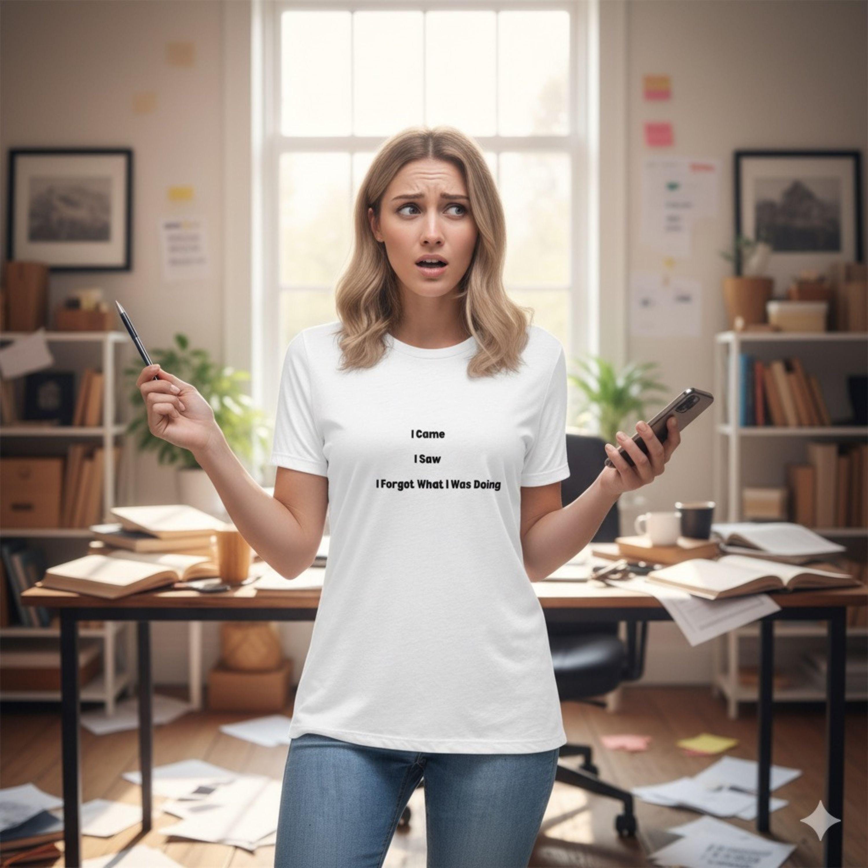 Add a playful punch to your wardrobe with this Funny Women’s T-Shirt, the perfect blend of humor, style, and comfort. Featuring a witty and sarcastic quote that reads "I Came, I Saw, I Forgot What I Was Doing," this tee is designed for bold women who love to express their personality with a little sass and a lot of laughs. Whether you're heading out for brunch, lounging at home, or looking for the ideal gift for your bestie or mom, this graphic tee is guaranteed to turn heads and spark conversations.