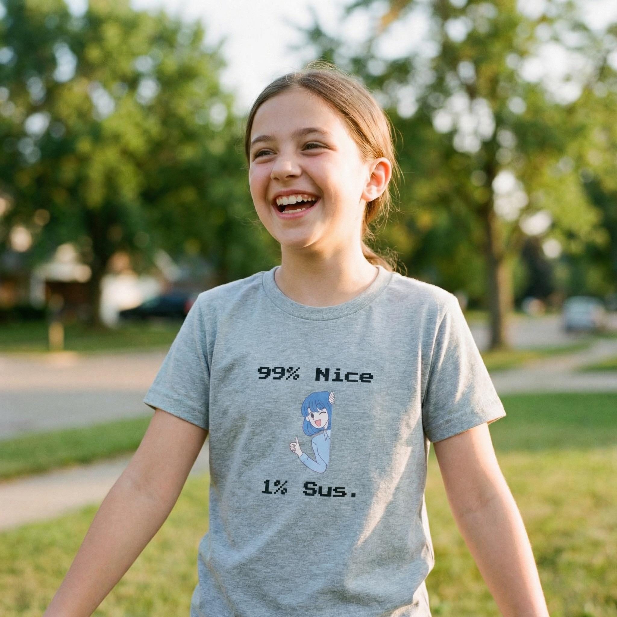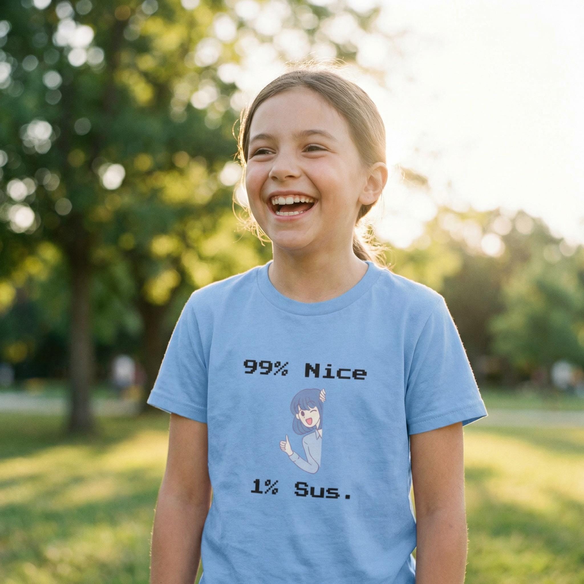 Celebrate your little gamer's fun and mischievous side with the Kids 99 Percent Nice 1 Percent Sus T-Shirt! This playful youth tee combines cute and cheeky style inspired by popular gamer memes and internet culture. Perfect for kids who love to make others laugh and show off their personality, this shirt features the fun phrase "99 Percent Nice, 1 Percent Sus" along with a charming cartoon character that adds an extra touch of humor.