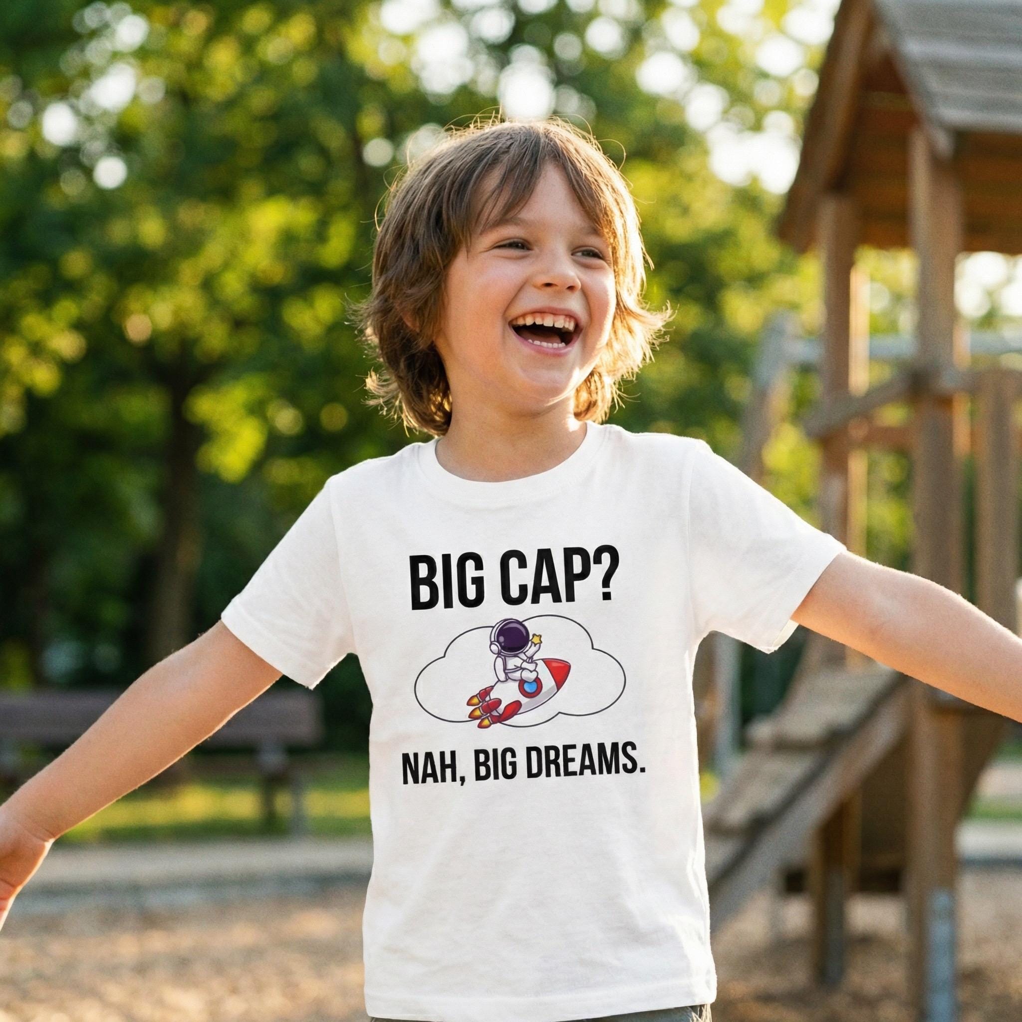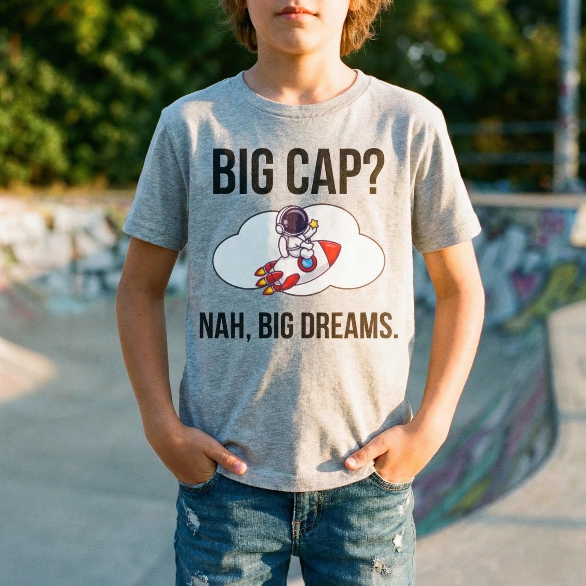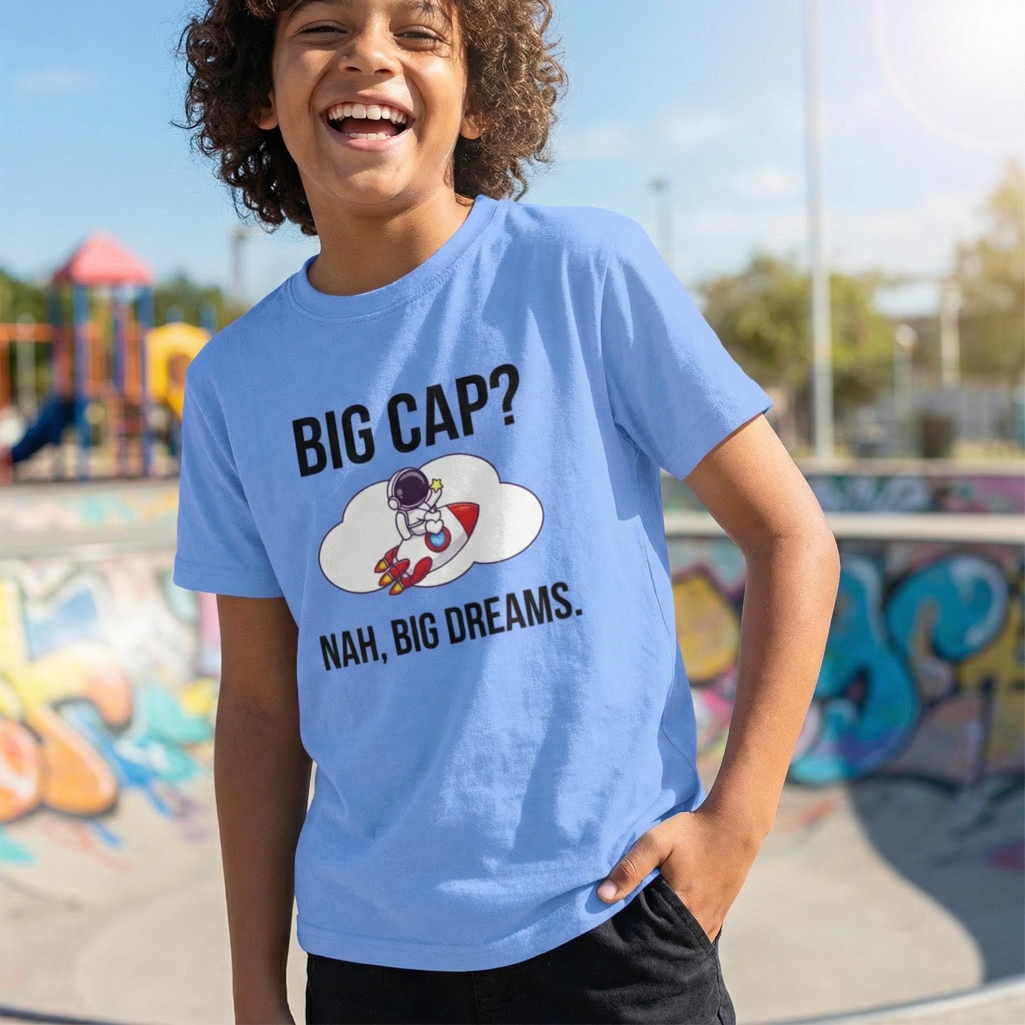 Featuring a fun and trendy design with a humorous twist on ambition, this confident kid top is a great conversation starter and a stylish way to boost your child's mindset. The eye-catching graphic shows an adorable astronaut with a playful message that says "BIG CAP? NAH, BIG DREAMS," reminding kids to aim high and believe in themselves.