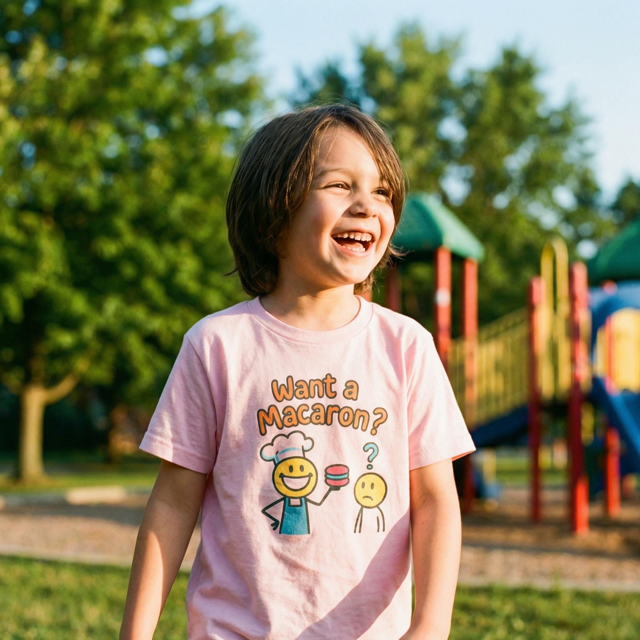 Introducing our adorable Kids Want a Macaron Meme T-Shirt, the perfect food joke tee for little snack lovers and dessert enthusiasts! This fun and quirky tee features a playful design inspired by viral internet humor, showcasing a cheerful character holding a colorful macaron and asking, “Want a Macaron?”—sure to bring smiles and laughter wherever your child wears it.