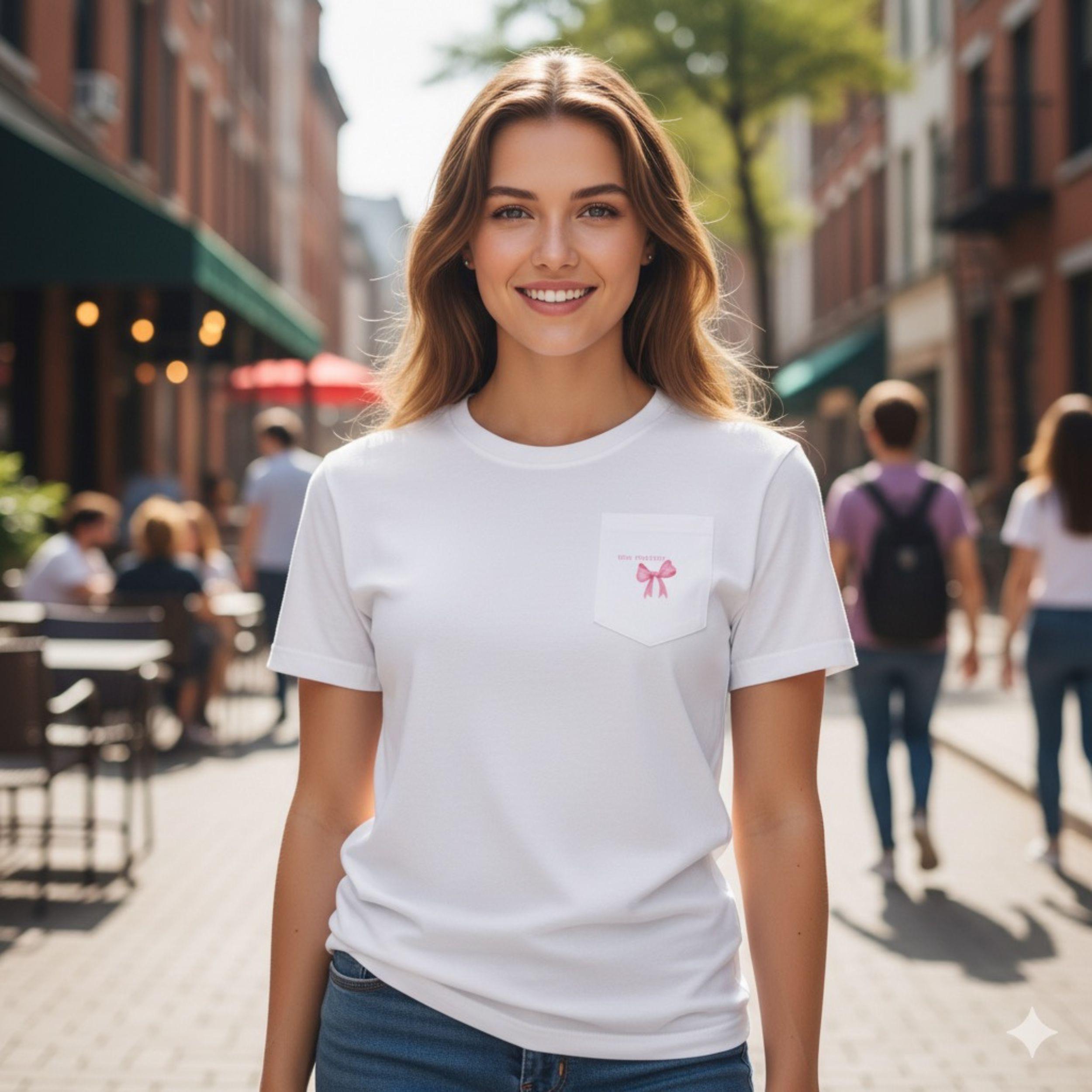 Embrace your soft girl aesthetic and express your playful personality with this trendy bow pocket tee — a must-have for anyone who loves cute graphic details and casual comfort!