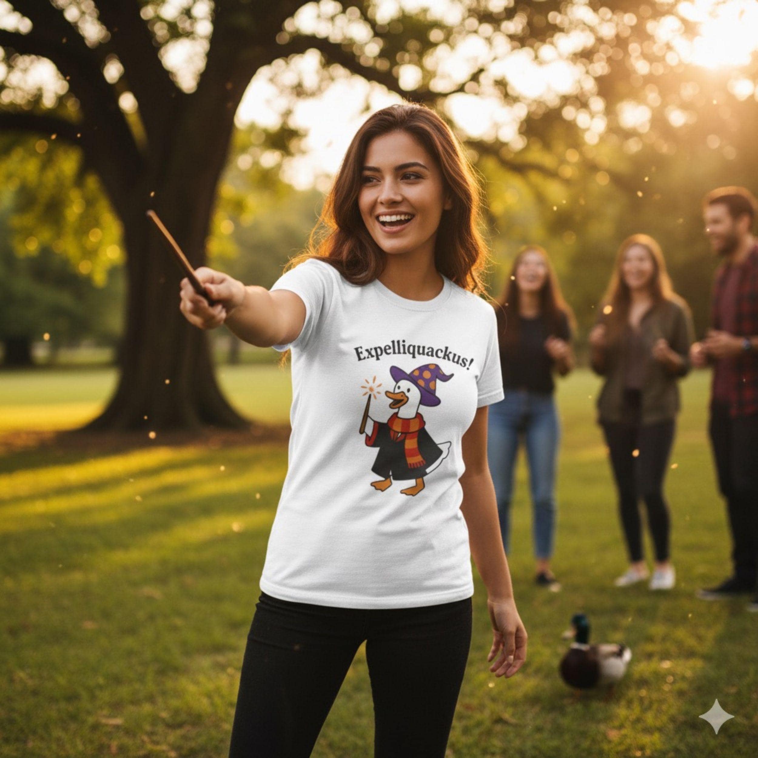 This Expelliquackus duck design T-shirt is perfect for those who love a touch of whimsy in their wardrobe. The garment-dyed fabric gives it a soft color and texture, making it comfortable and stylish. Ideal for adults looking for a unique and playful addition to their casual or semi-formal outfits. Perfect for fans of ducks or magical themes. Great for everyday wear or as a fun gift for celebrations and special occasions.