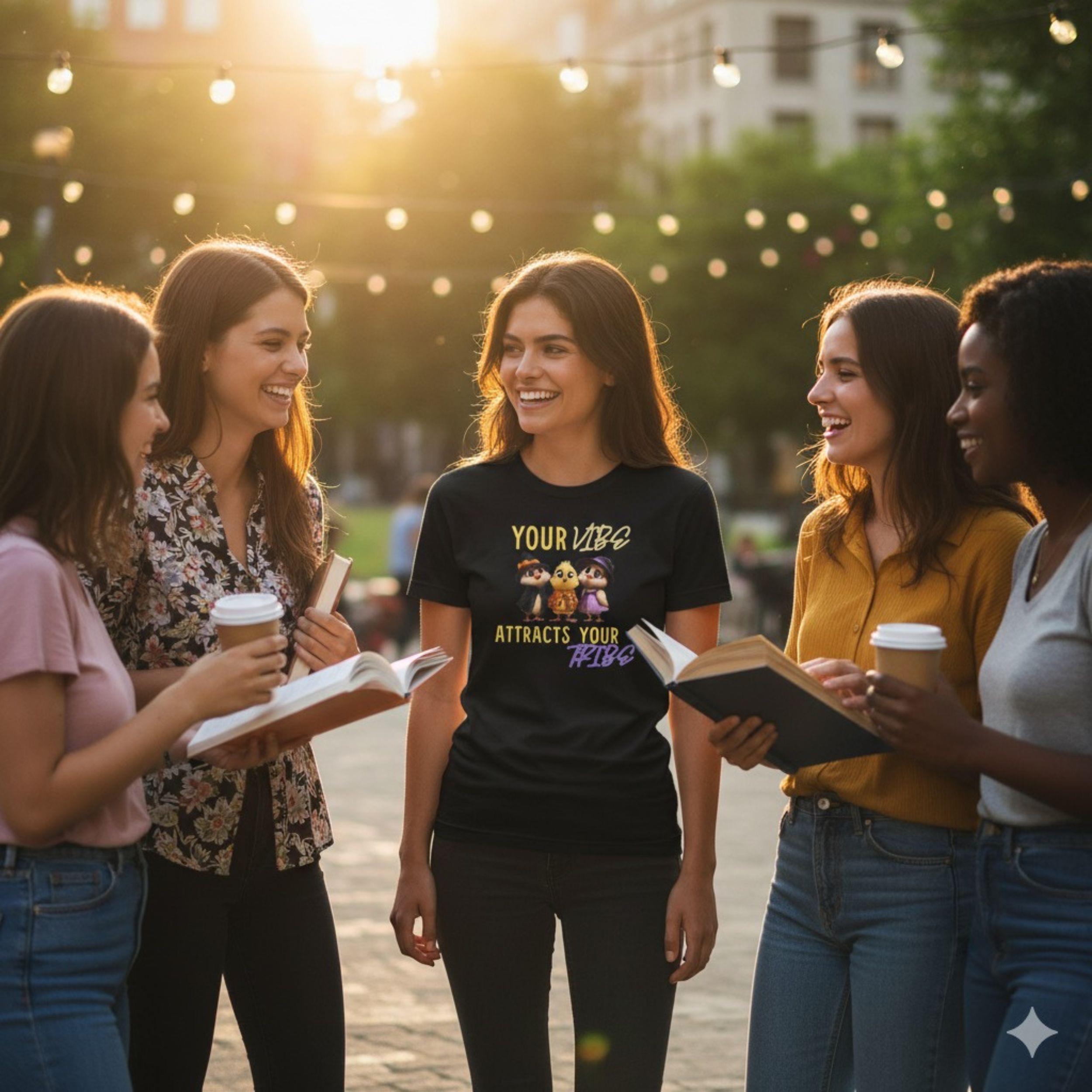 - Bright, playful graphic with "Vibe Attracts" message to spread good energy