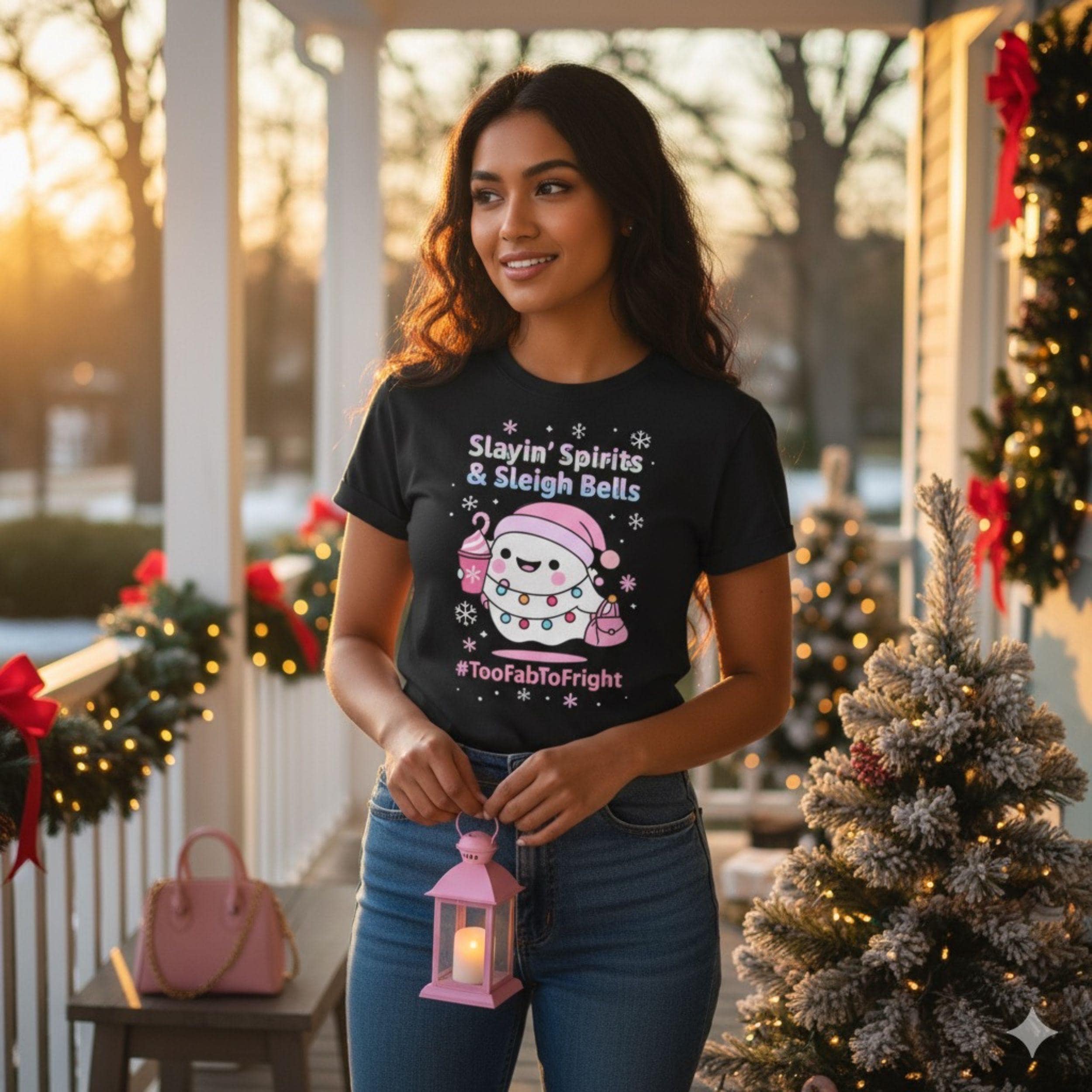 Who says spooky season has to end in October? With this Slayin’ Spirits and Sleigh Bells Christmas T-shirt, you can keep the ghostly vibes alive straight through the holidays. Featuring an adorably creepy ghost who’s clearly in the Christmas spirit, this tee is perfect for anyone who prefers a little haunt with their holiday cheer.
