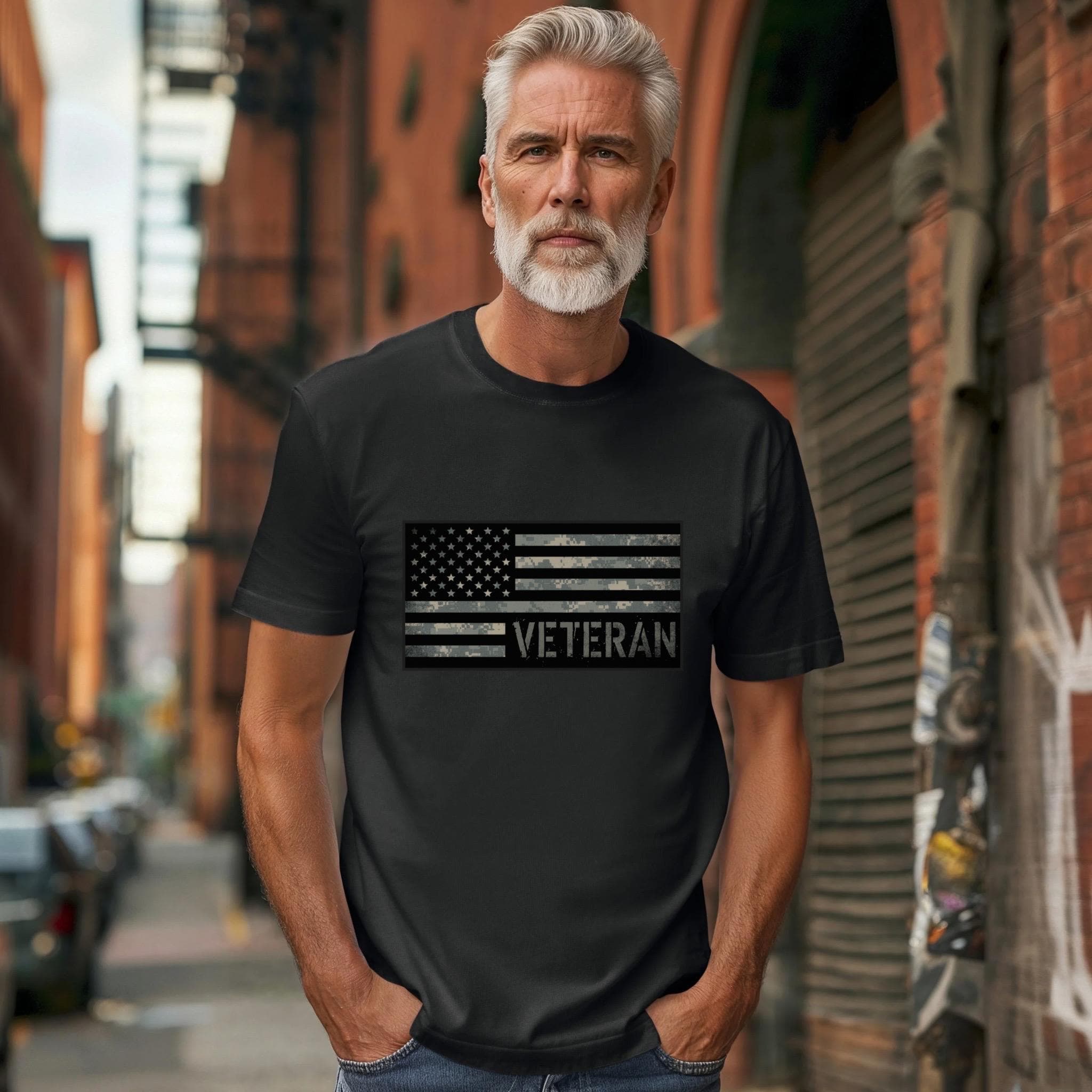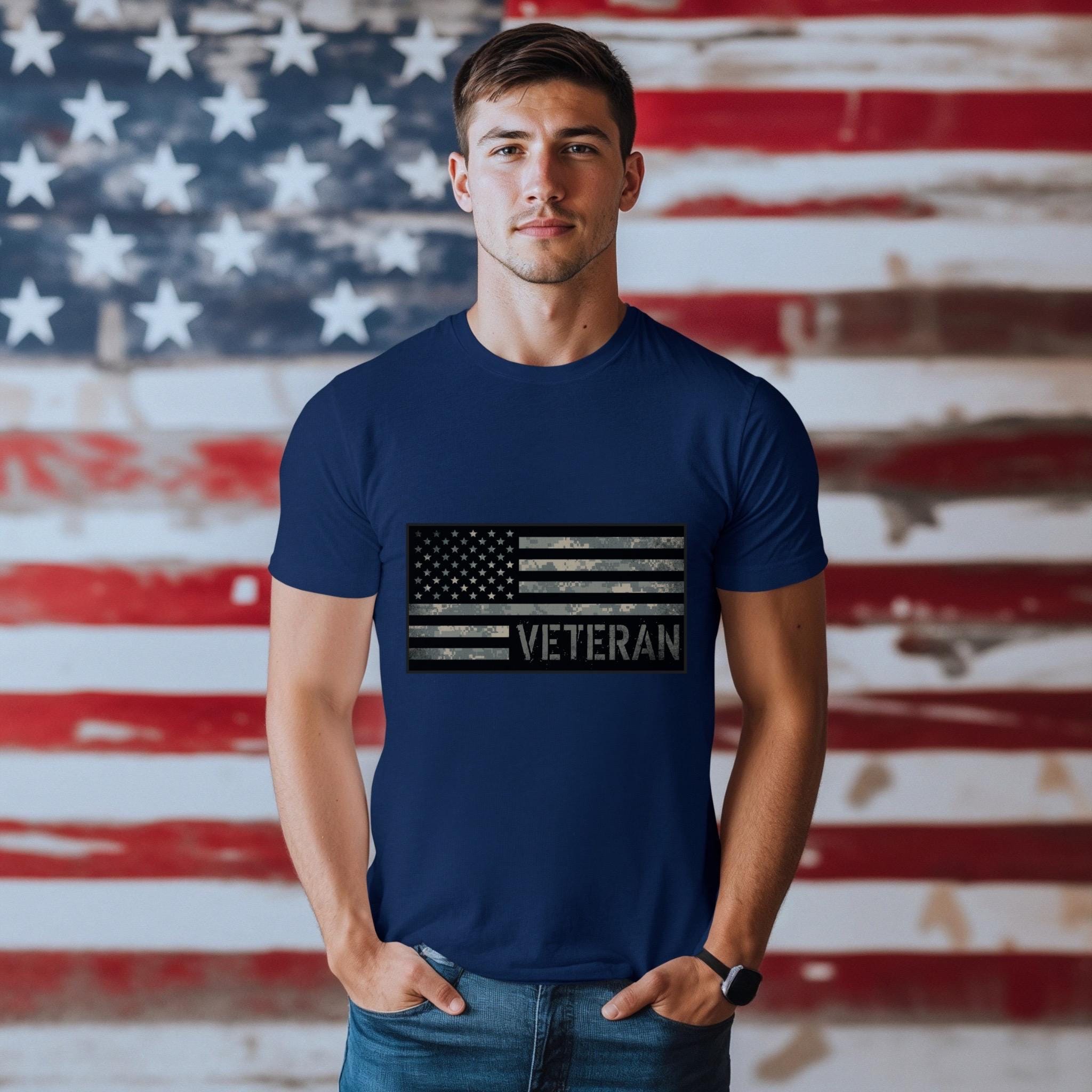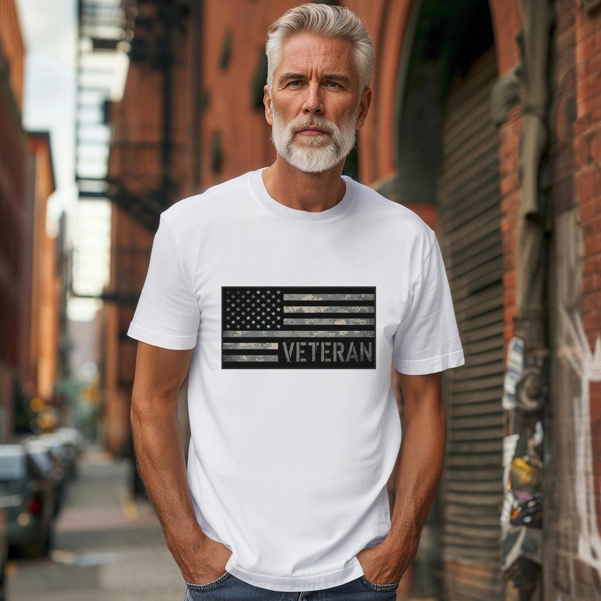 Show your patriotic pride with our Vintage Veteran Flag T-shirt, a unisex design perfect for honoring military service and celebrating America. Crafted from 100% ring-spun US cotton, this patriotic tee offers exceptional comfort and durability, making it an ideal choice for veterans, military personnel, or anyone who wants to support and celebrate the USA.