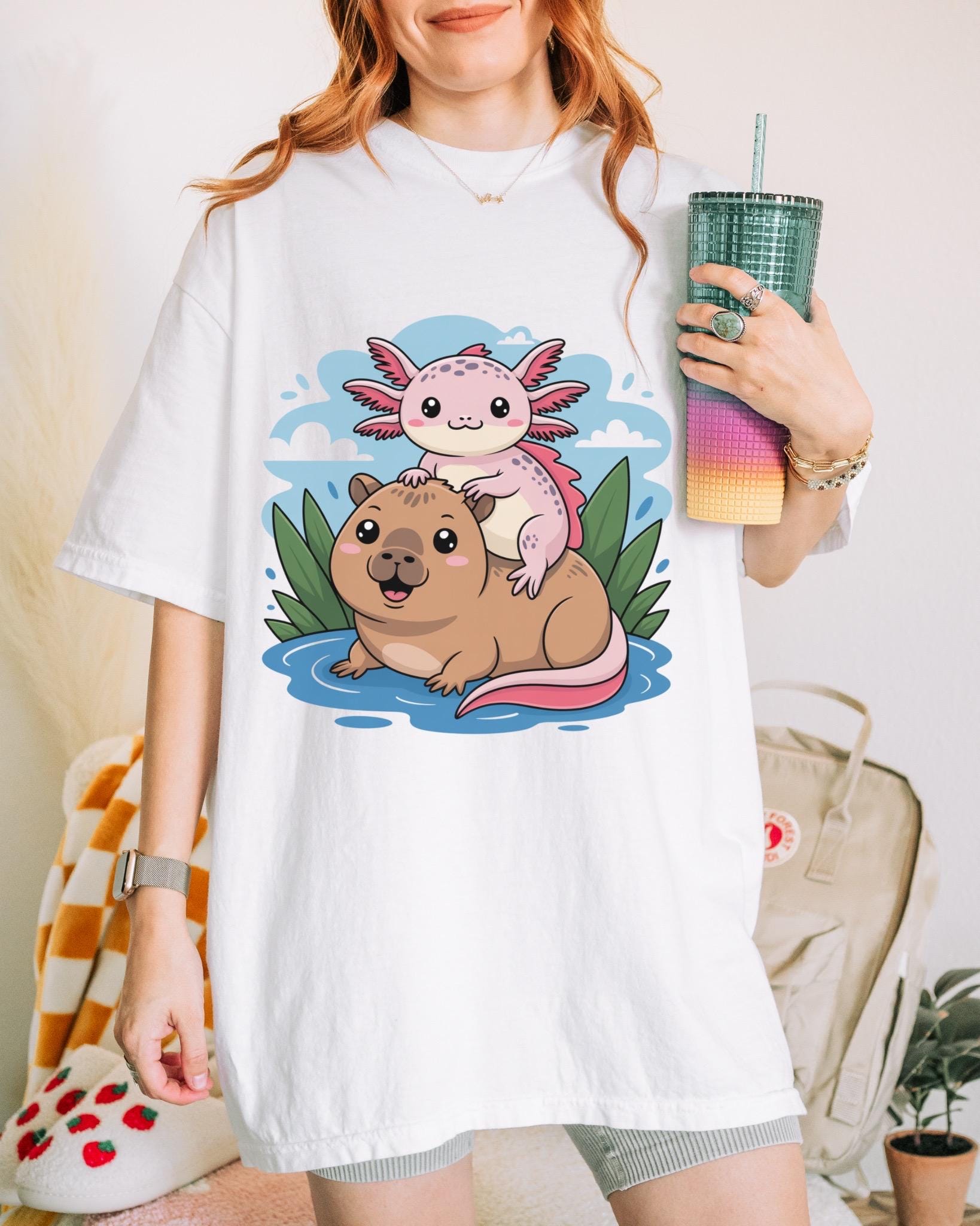 This adorable T-shirt features an illustration of an Axolotl and Capybara, giving off a cute and whimsical vibe. Perfect for animal lovers and nature enthusiasts, this T-shirt is great for casual wear or as a thoughtful gift for friends and family. Ideal for birthdays, holidays, or any occasion where a unique and fun shirt is needed.
