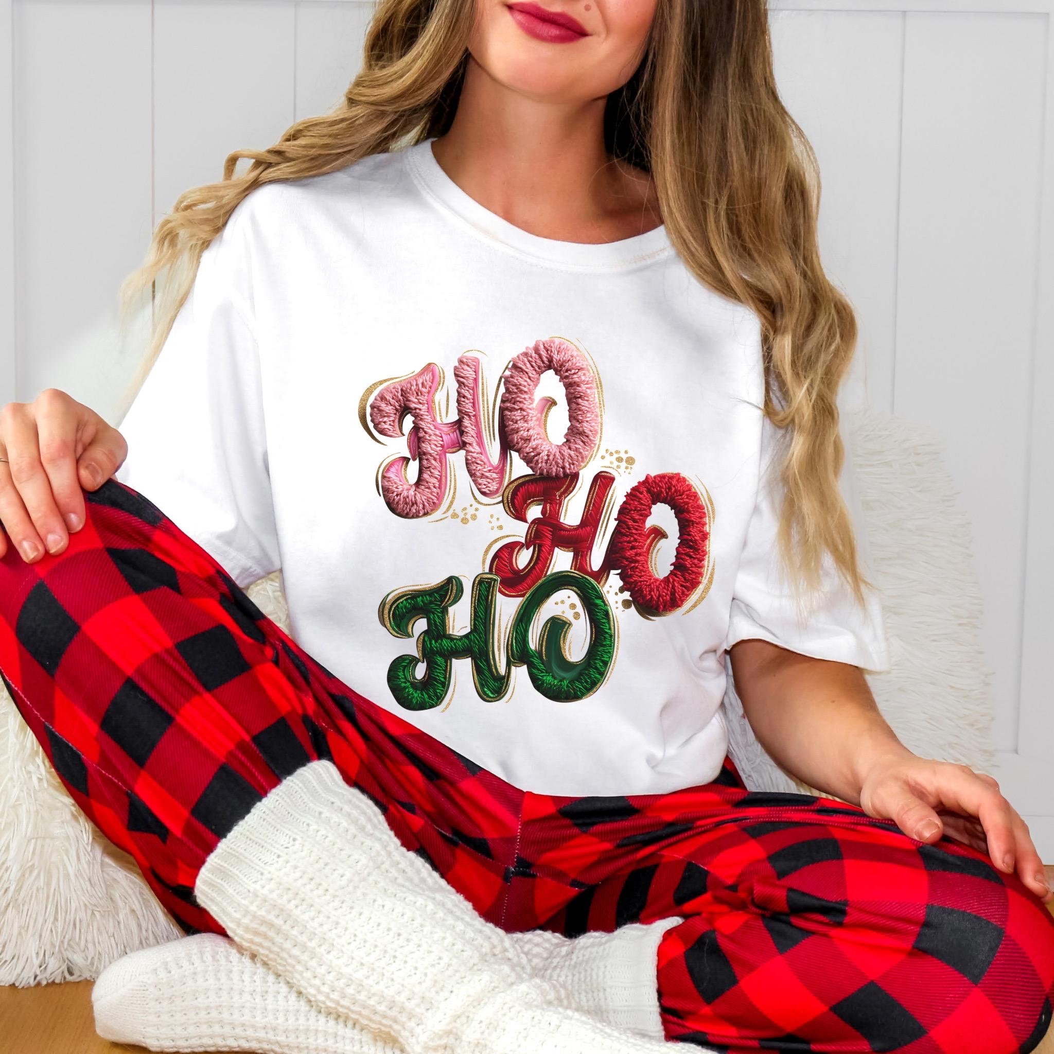 Christmas Ho Ho Ho Shirt Holiday Apparel Festive Design Crochet Faux Puffy Texture Comfort Colors Wear Claus Tee Unisex Gift Xmas Outfit