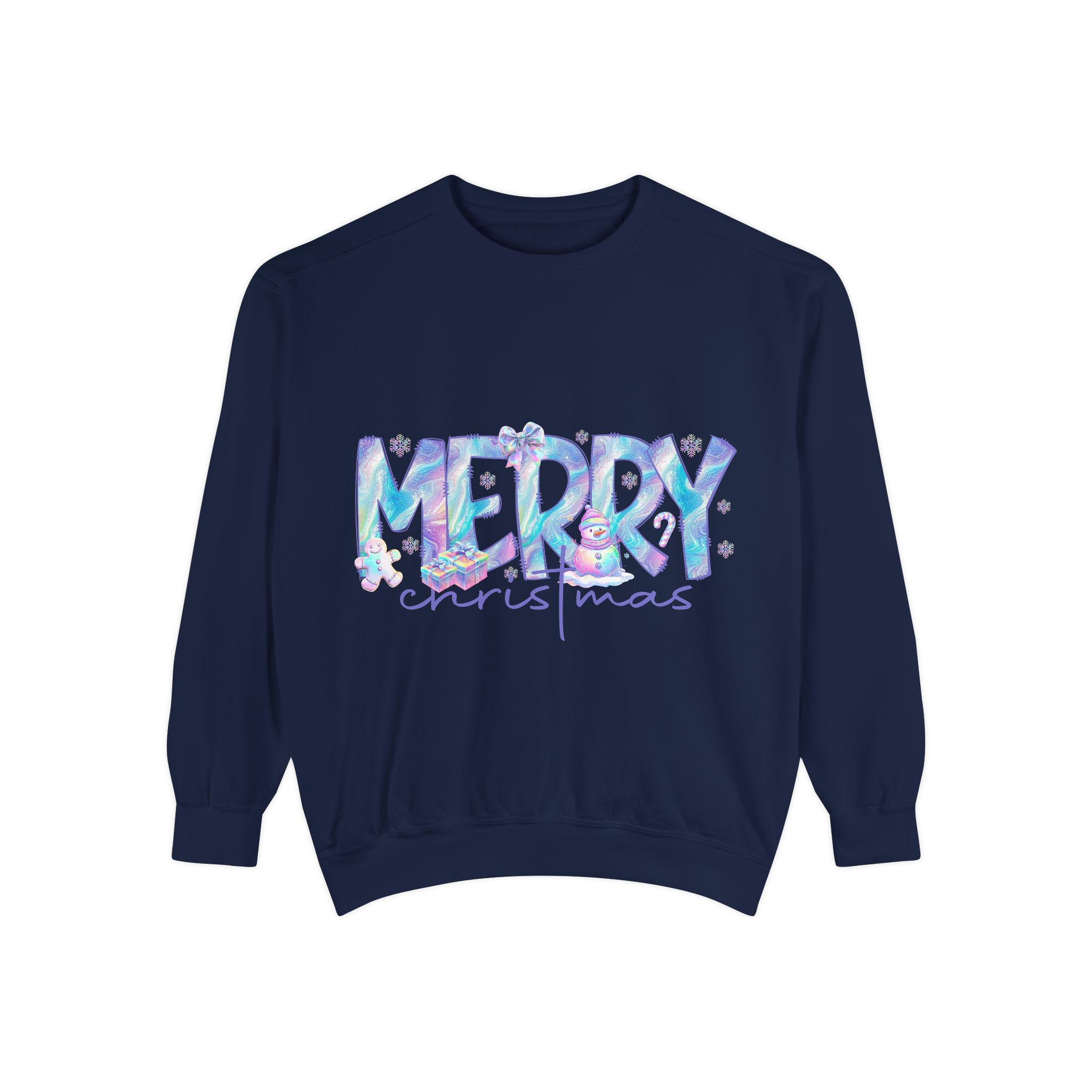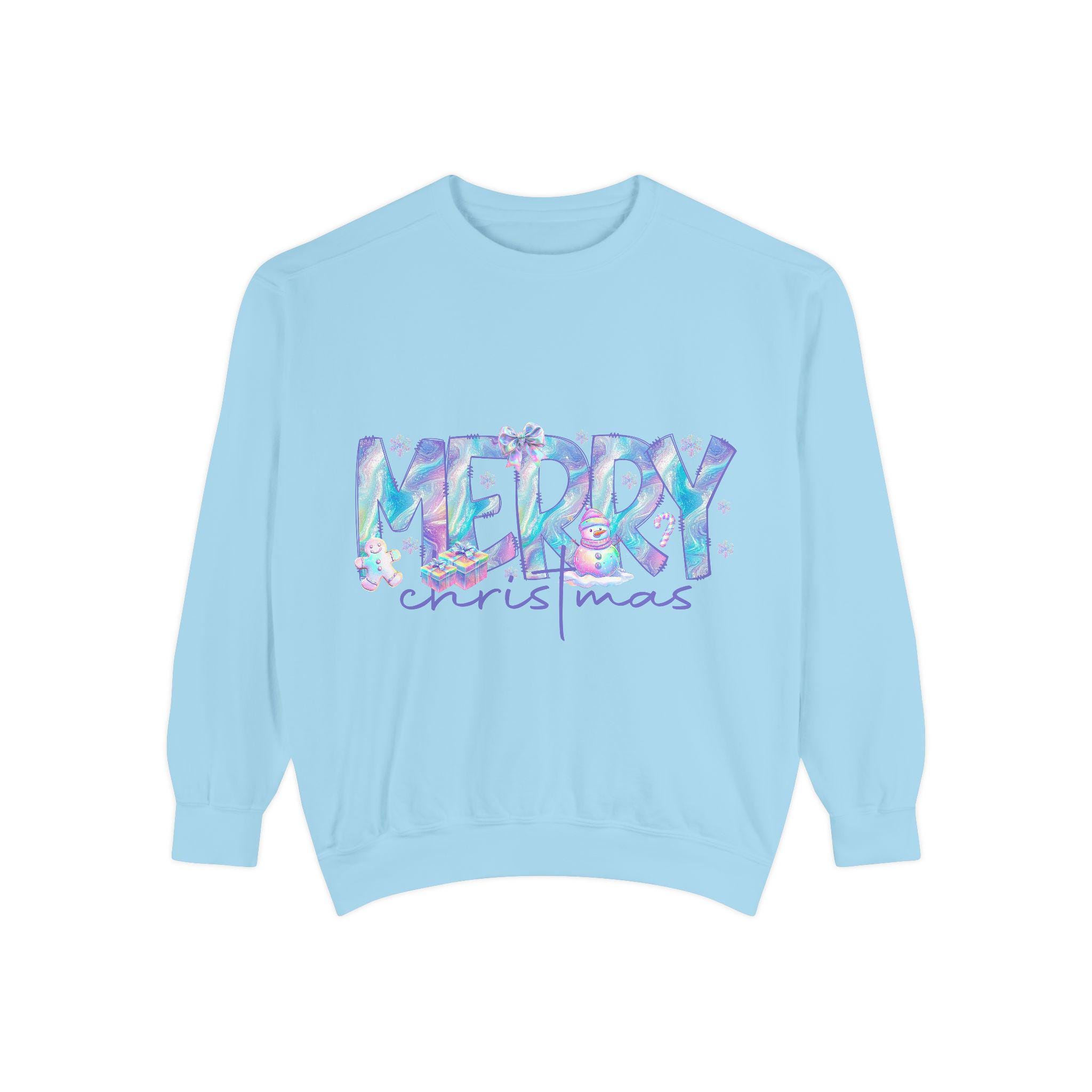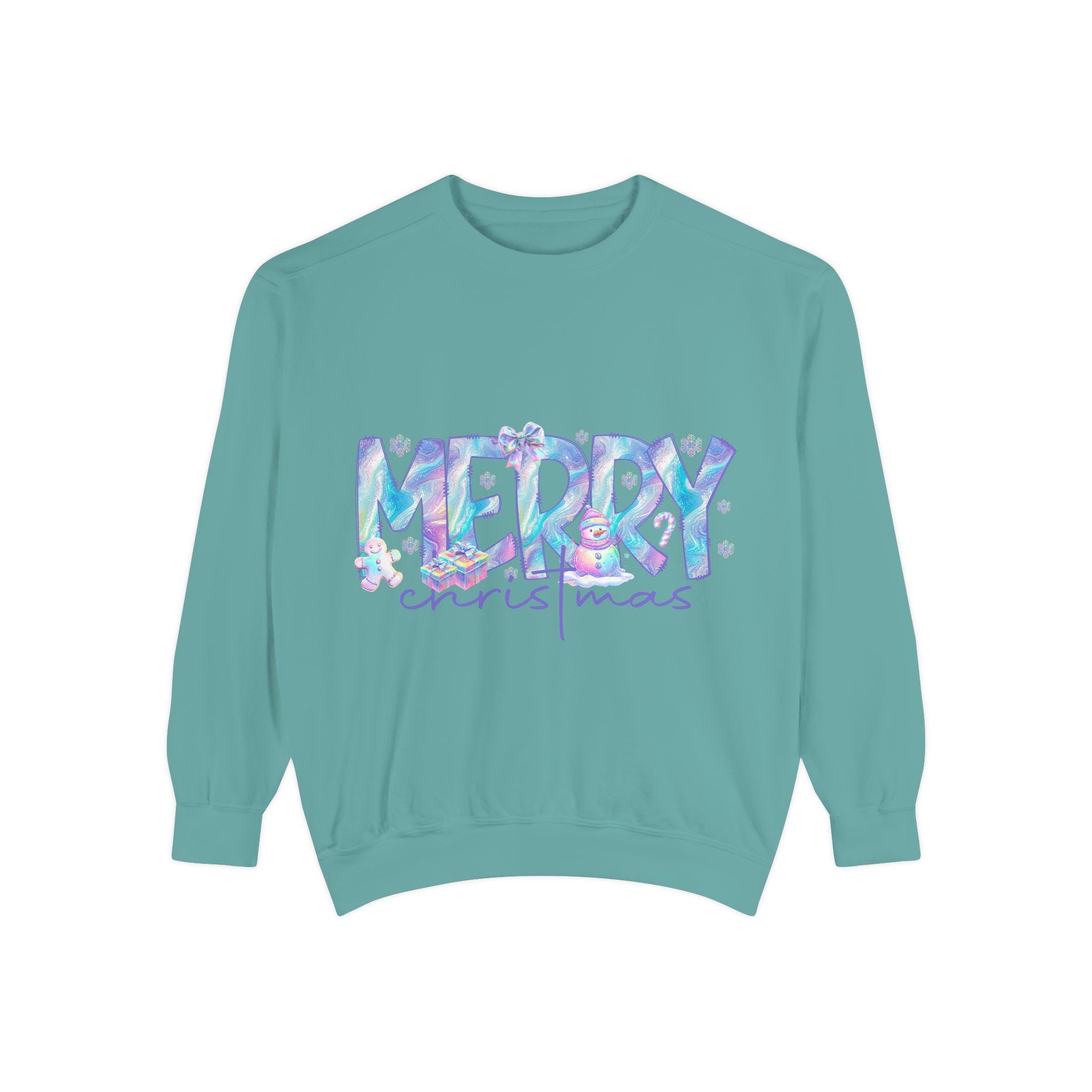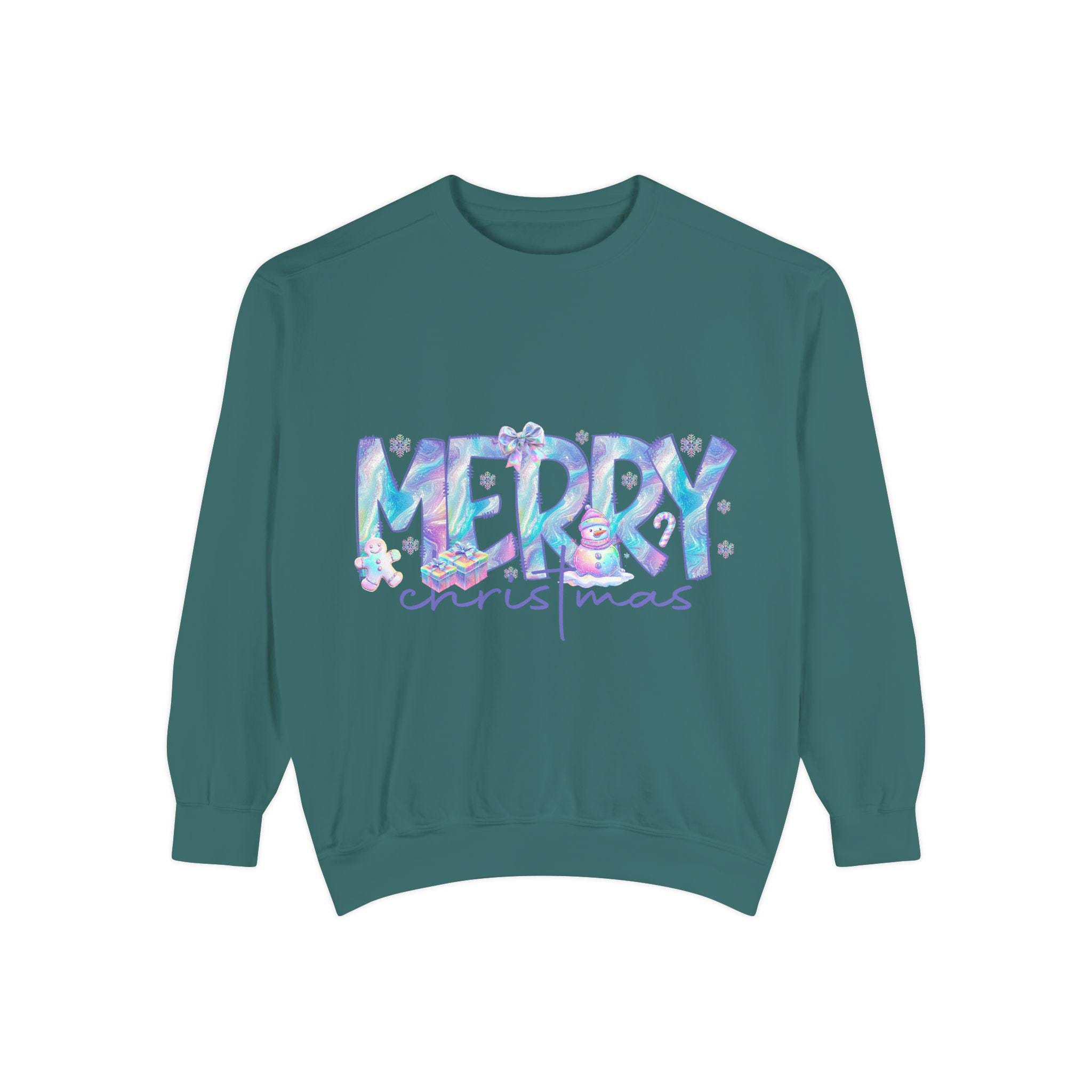 Iridescent Merry Christmas sweatshirt, holiday jumper, Xmas clothing, festive top, soft cotton-polyester fabric, embroidered option