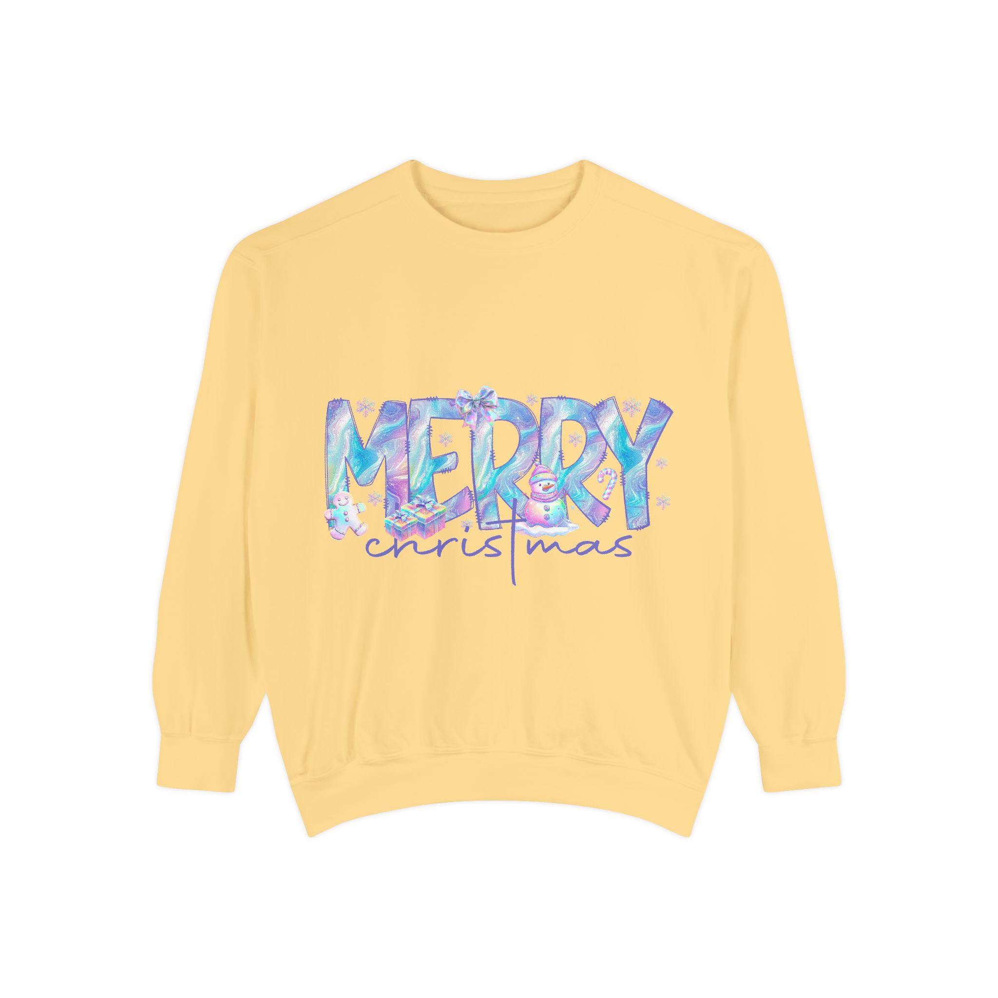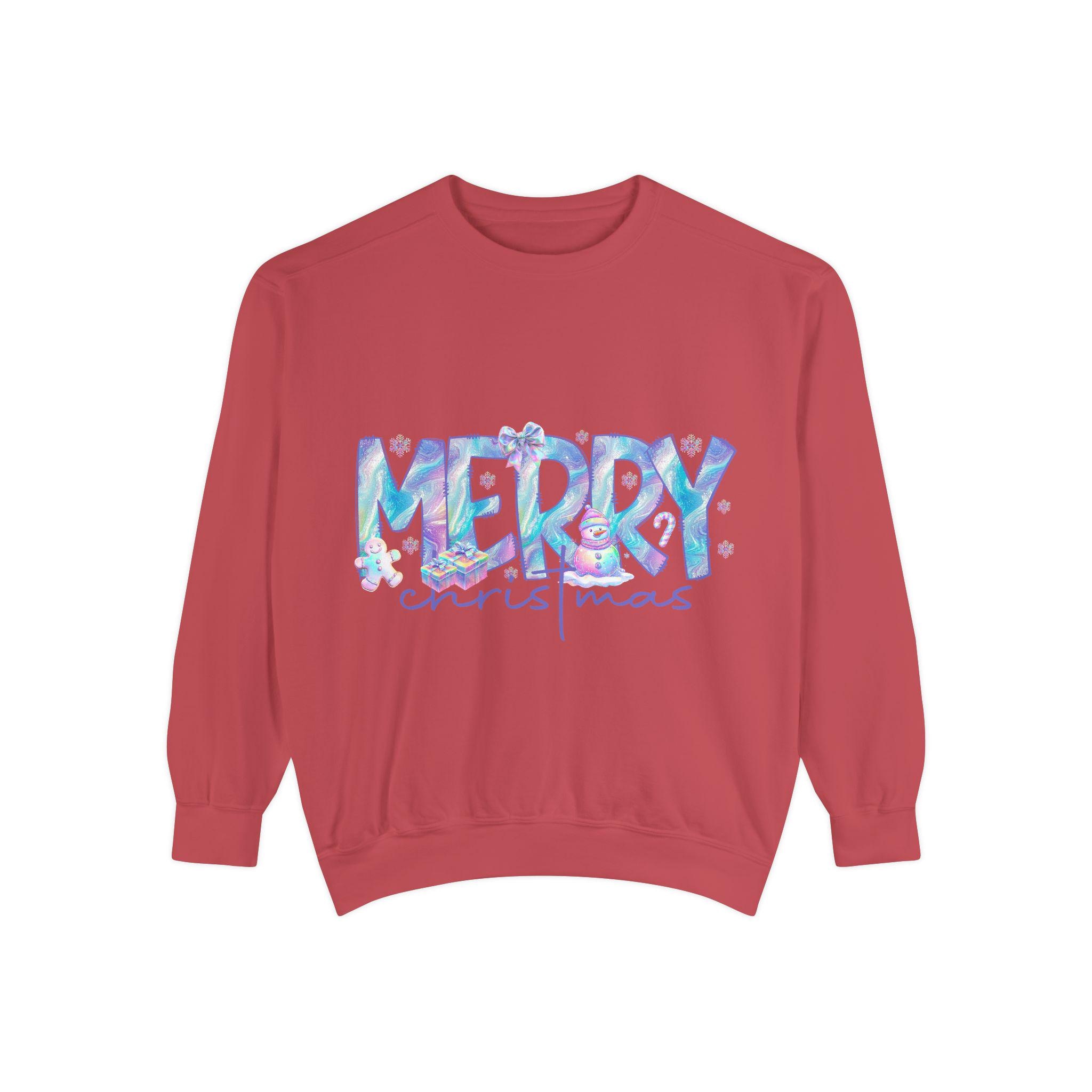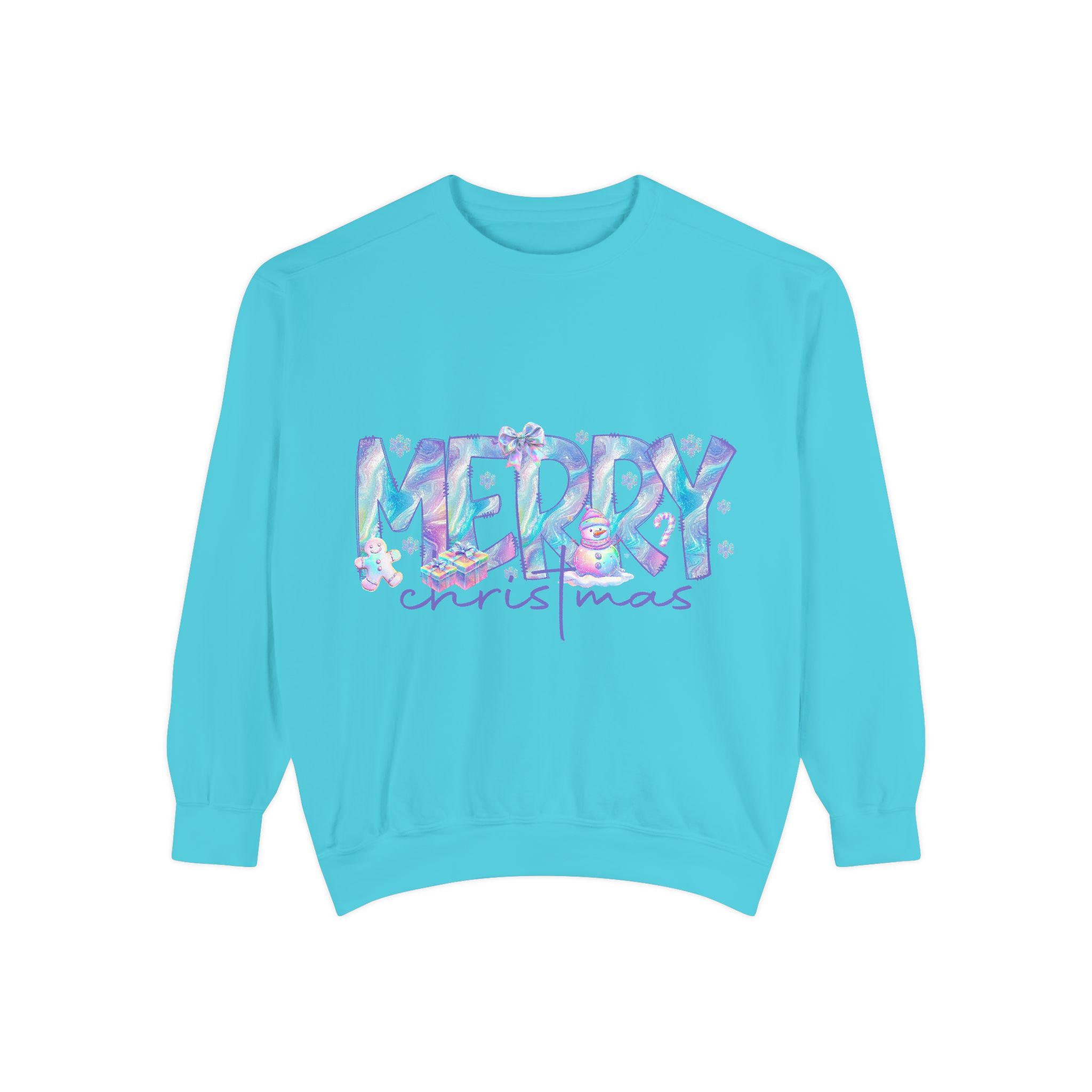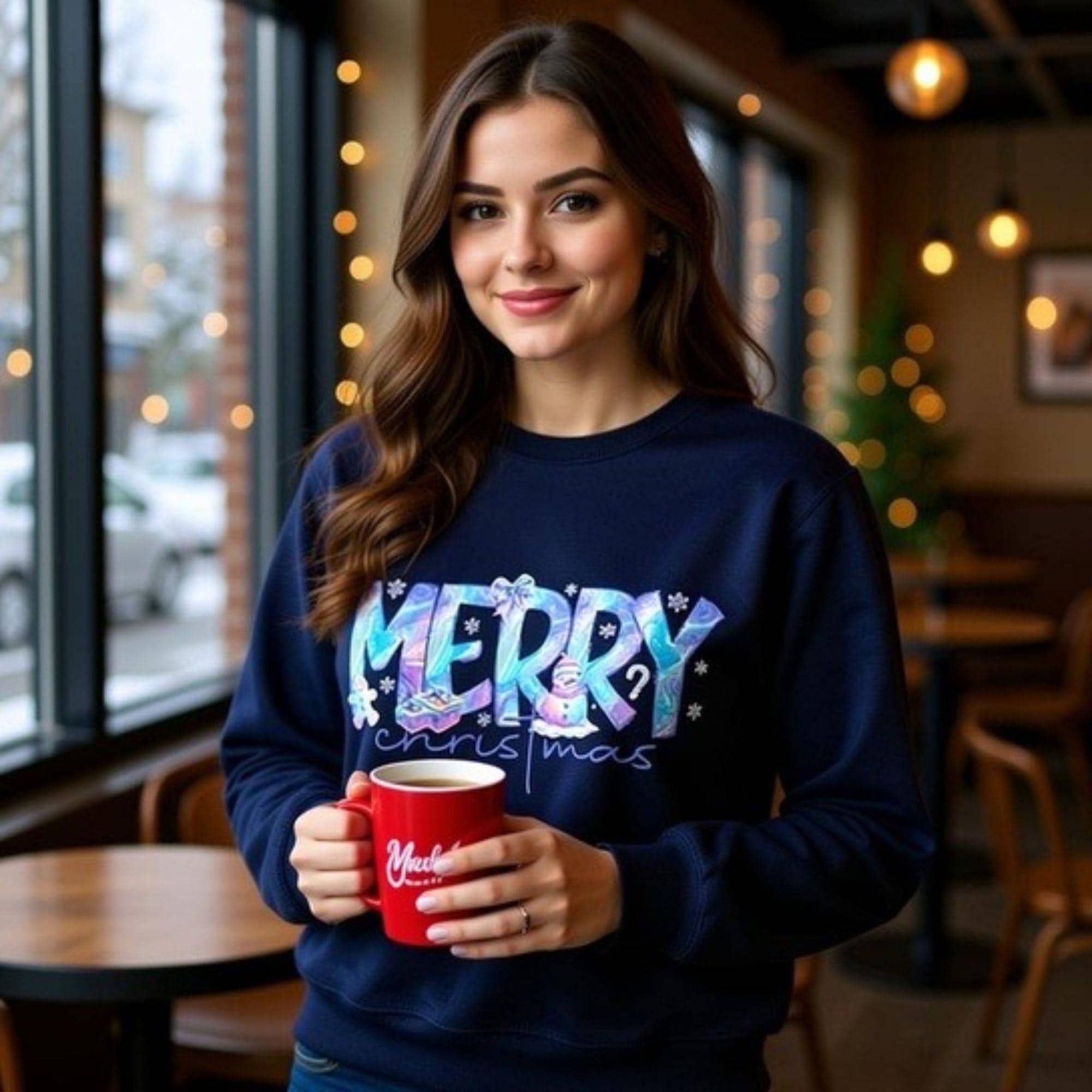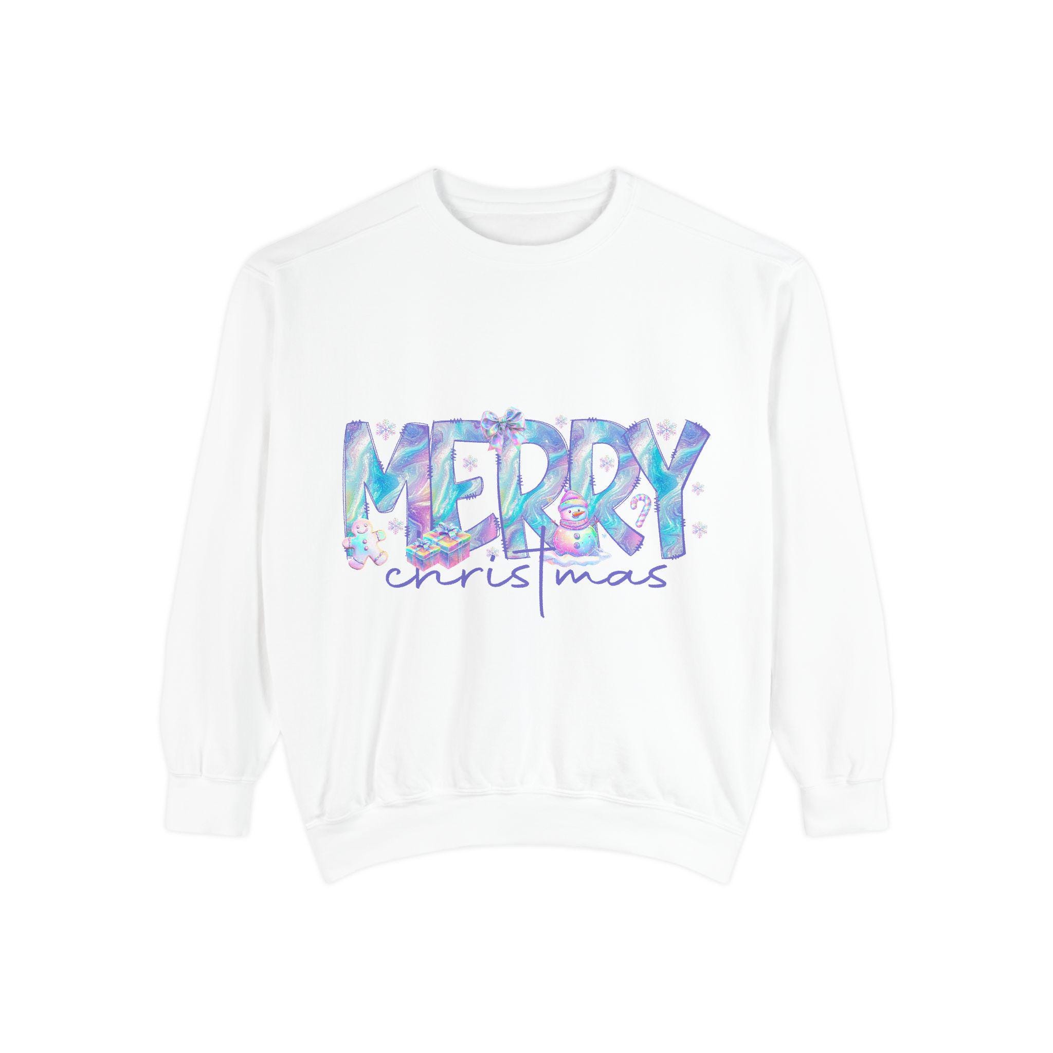 Iridescent Merry Christmas sweatshirt, holiday jumper, Xmas clothing, festive top, soft cotton-polyester fabric, embroidered option