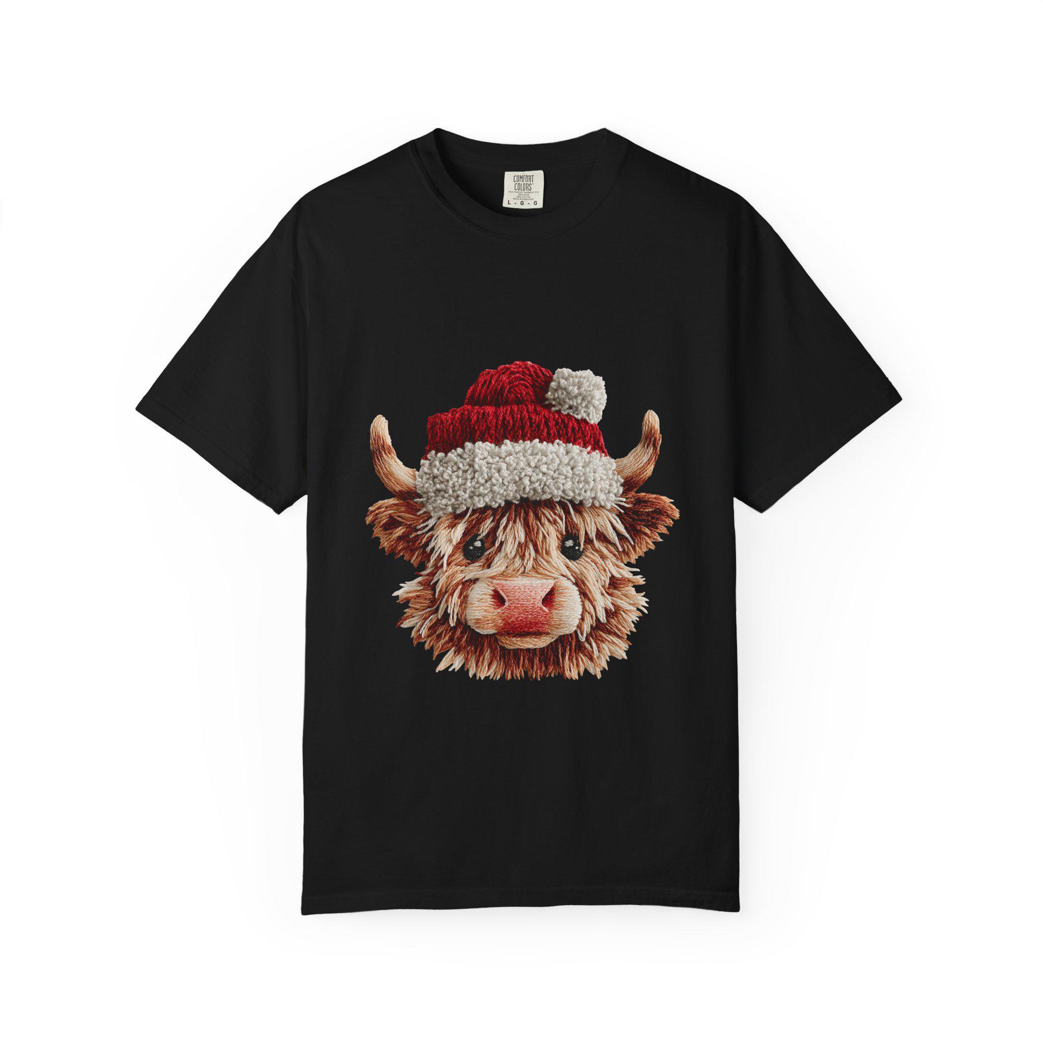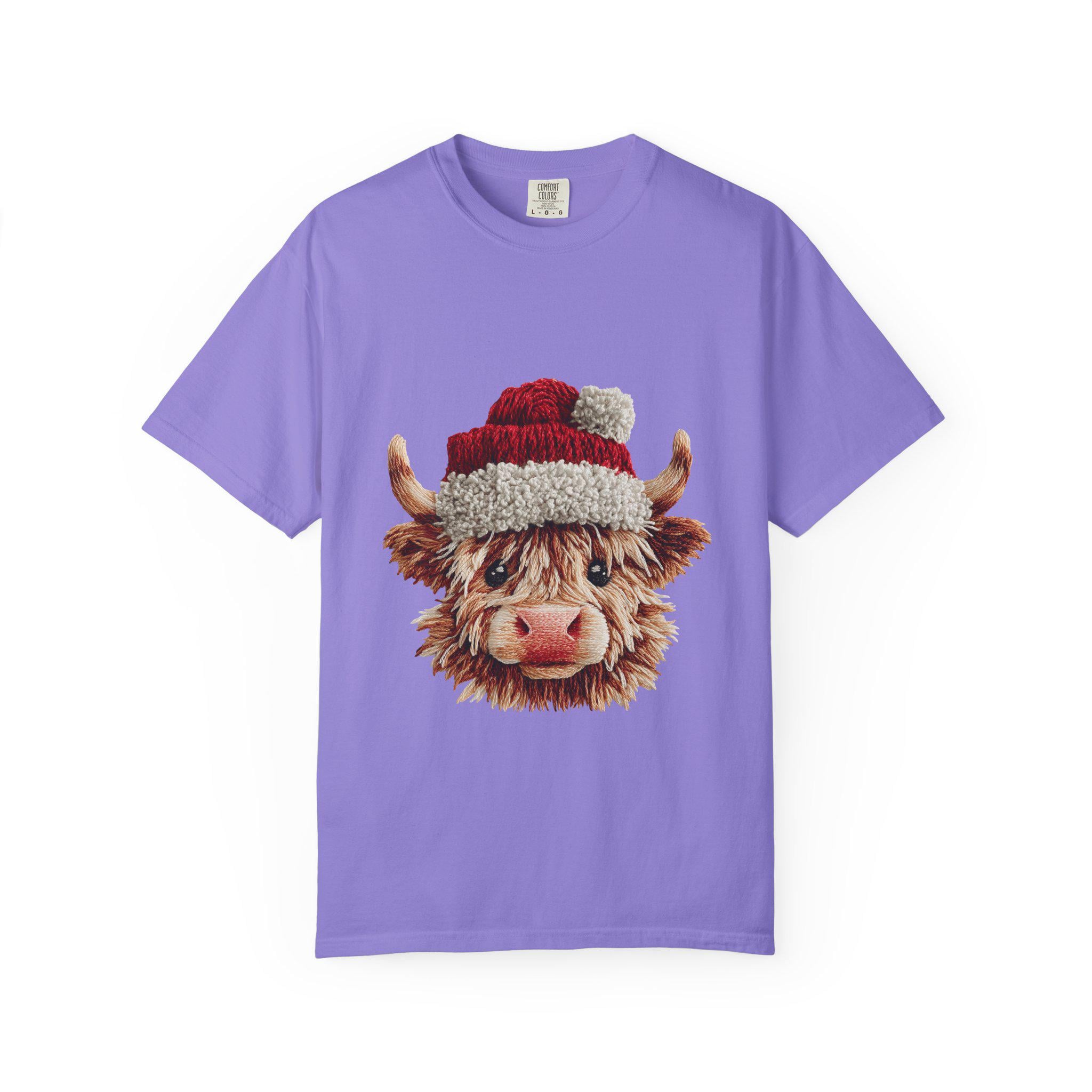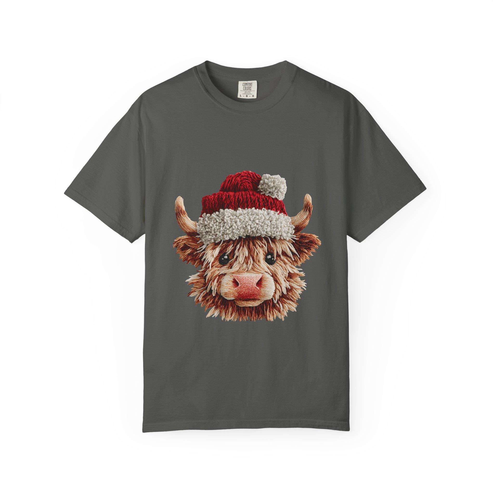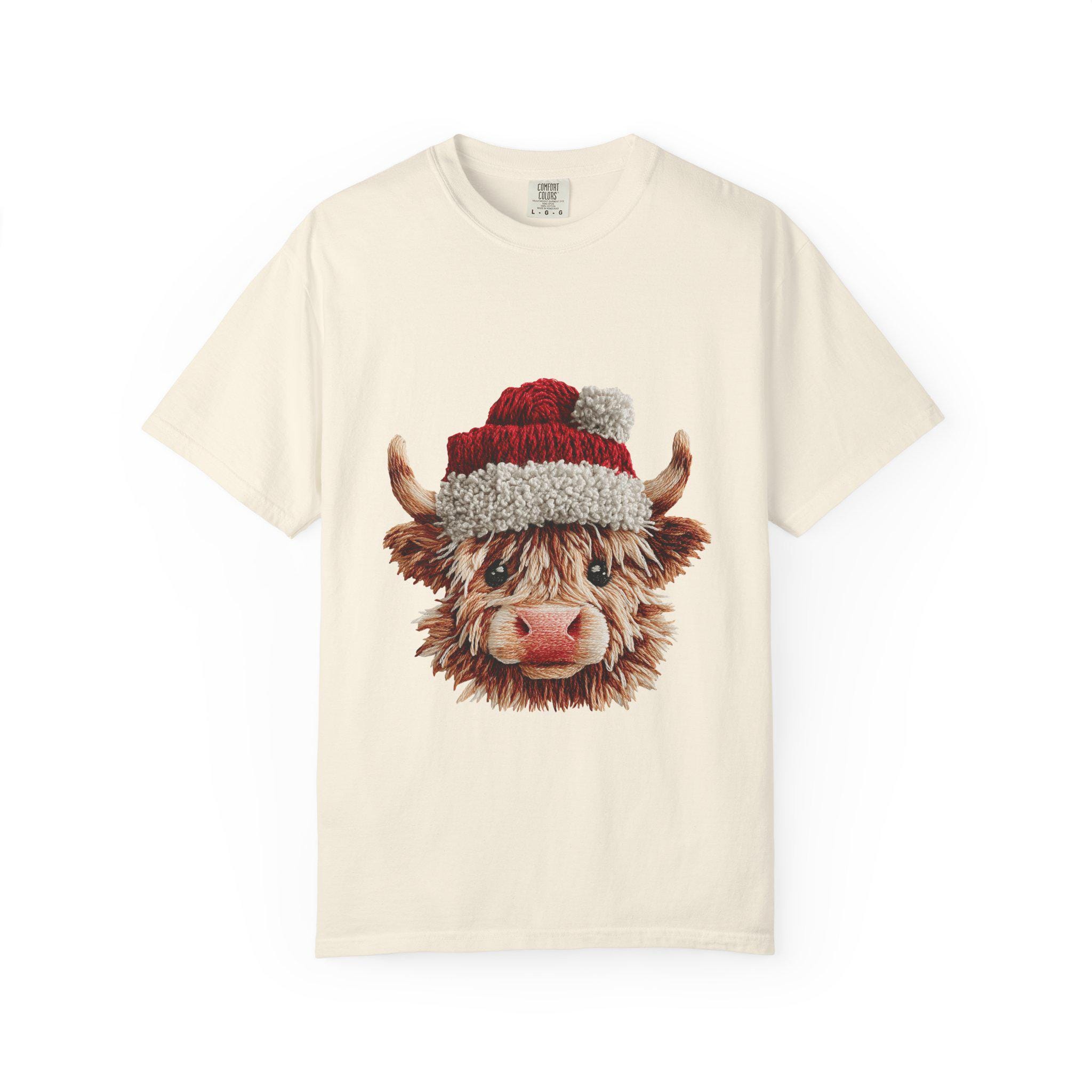 Comfort Colors Highland Cow T-shirt | Faux Crochet Yarn Santa Design | Christmas Animal Tee | Farm Animal Holiday