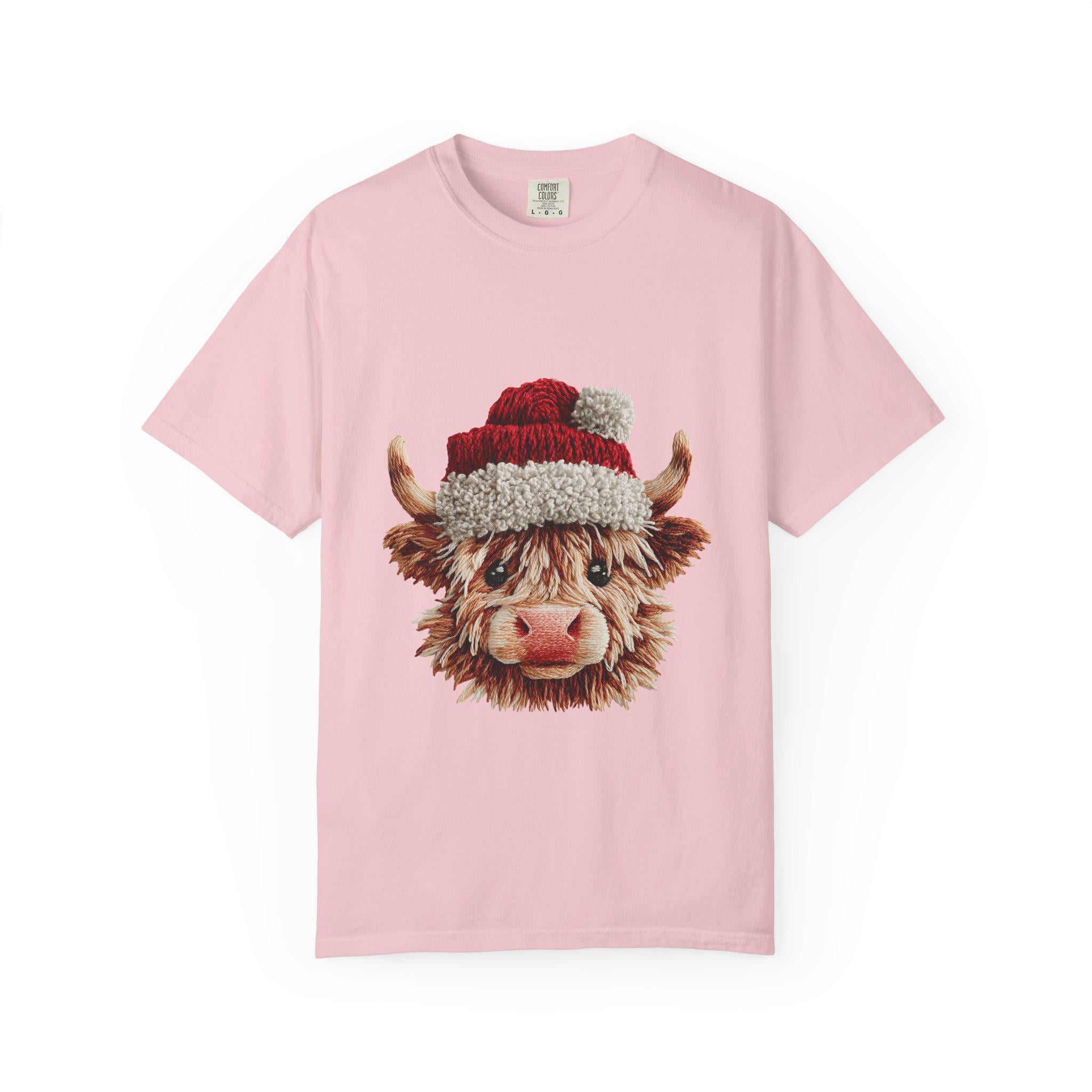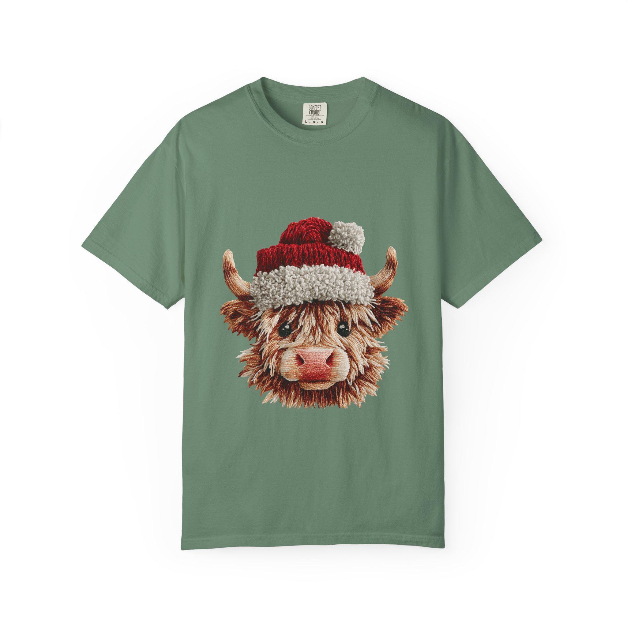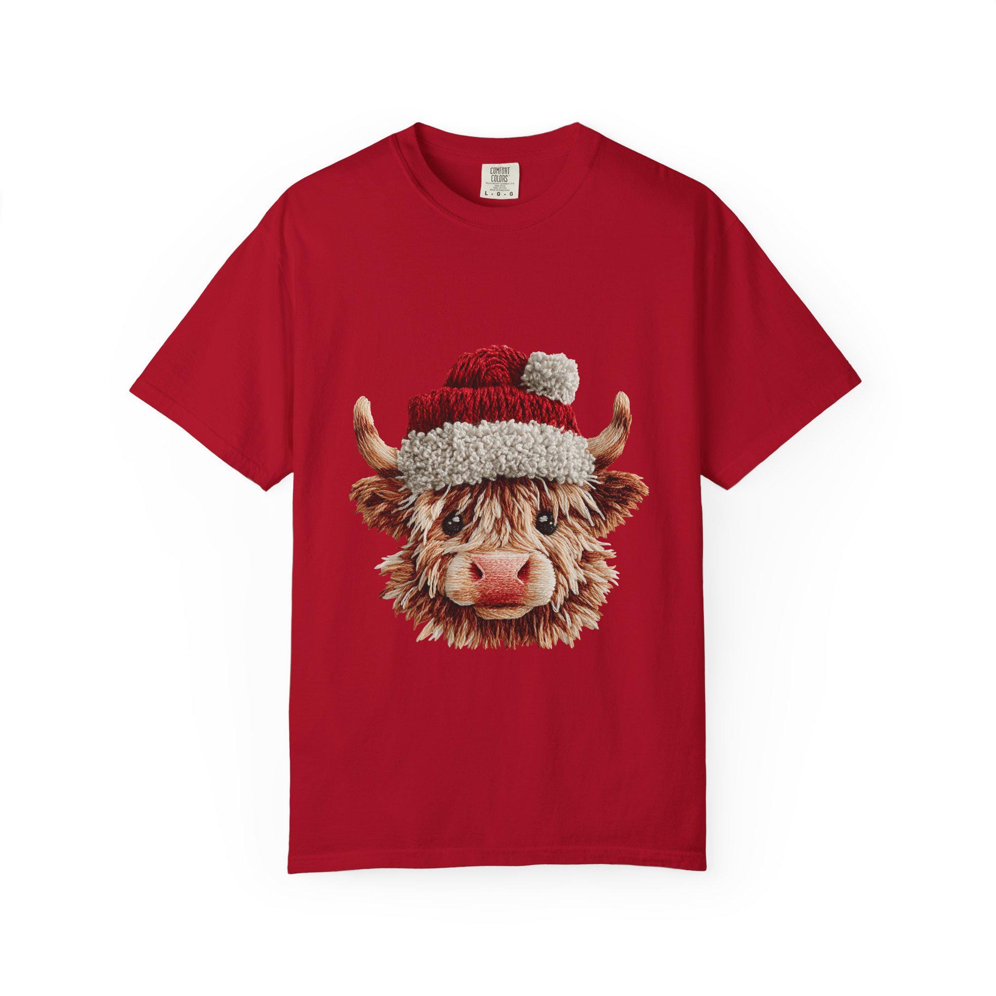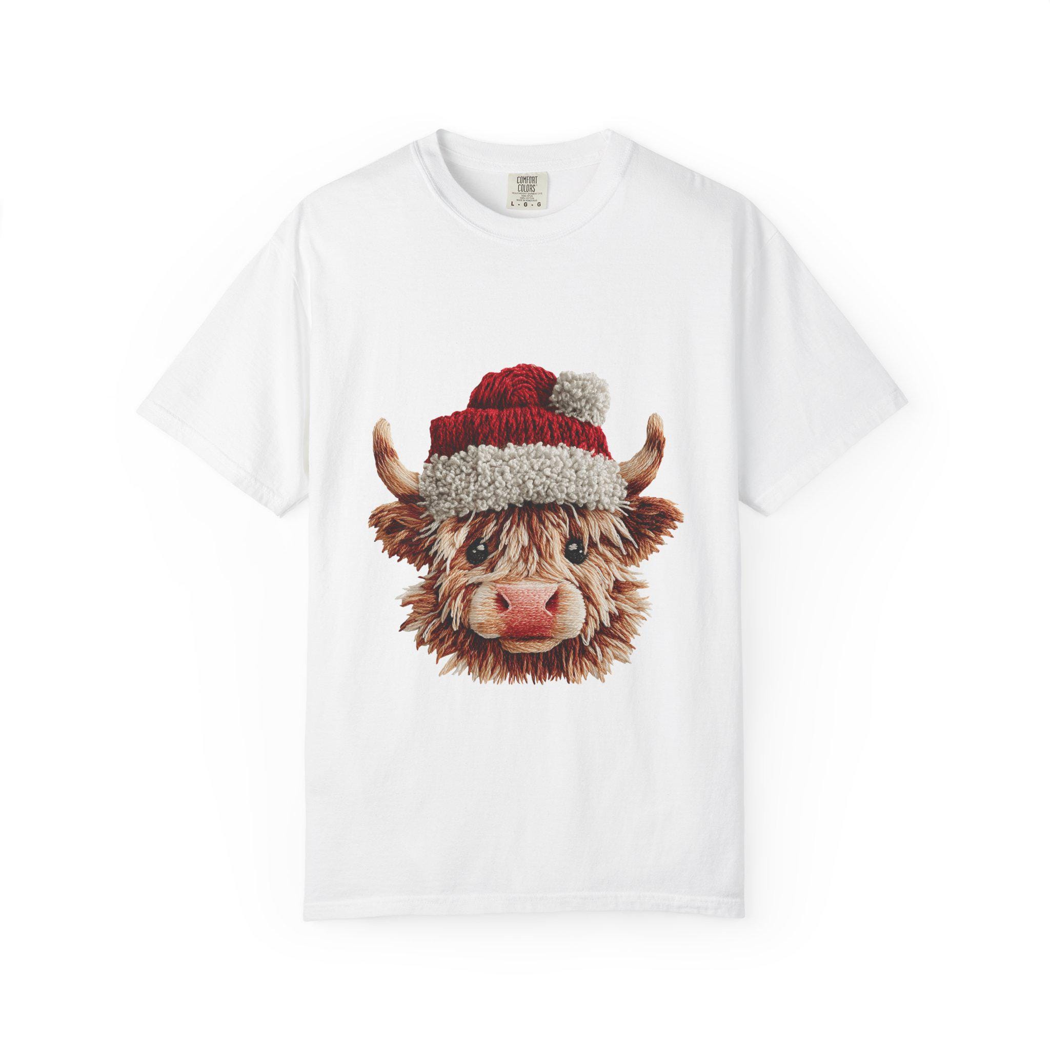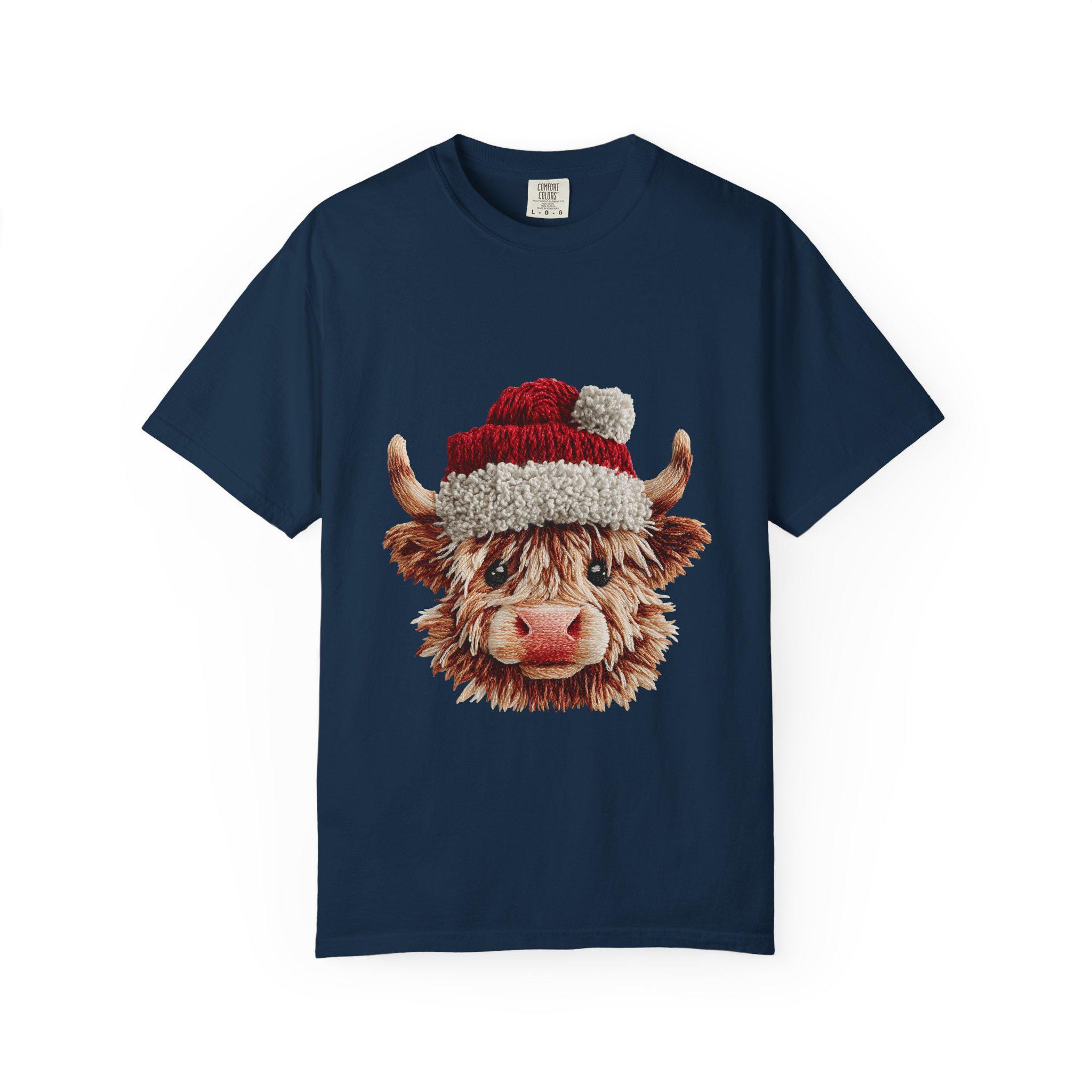 Comfort Colors Highland Cow T-shirt | Faux Crochet Yarn Santa Design | Christmas Animal Tee | Farm Animal Holiday