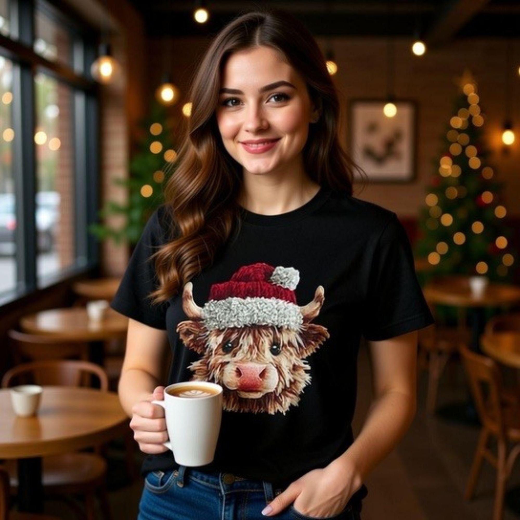 Celebrate the holiday season in style with our Comfort Colors Highland Cow T-shirt featuring a charming faux crochet yarn Santa design. This festive animal tee is perfect for Christmas gatherings, farm animal lovers, or anyone looking to add a whimsical touch to their holiday wardrobe. The adorable Highland Cow wearing a Santa hat brings a cozy, festive vibe that’s sure to make everyone smile.