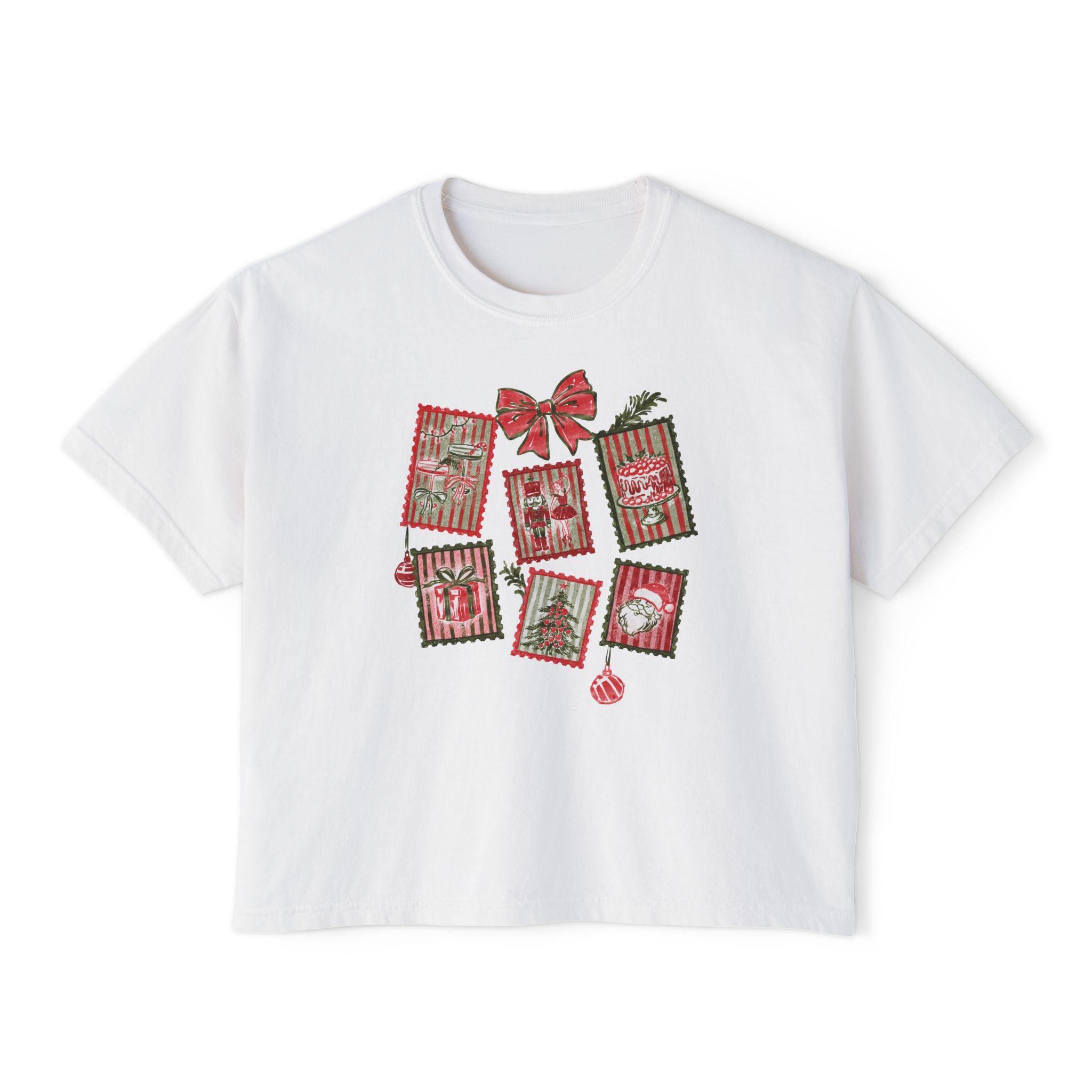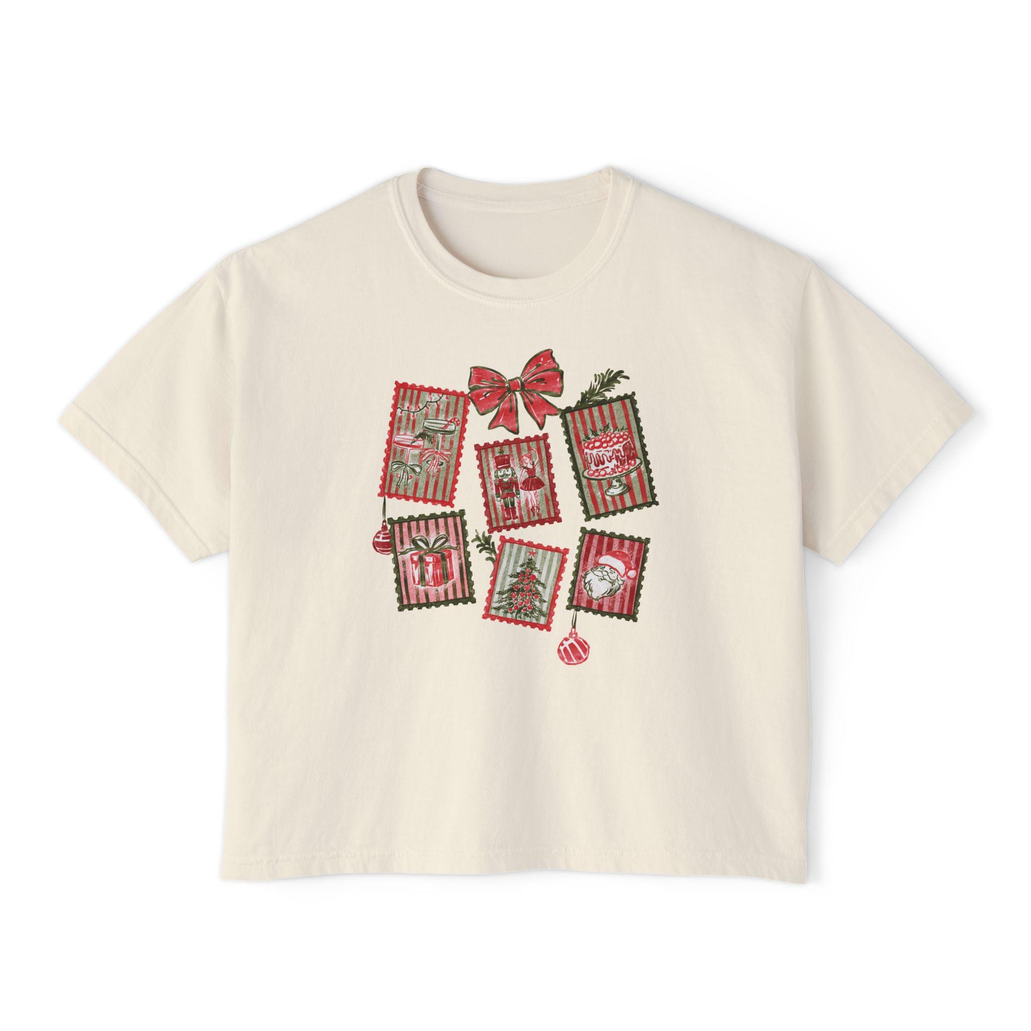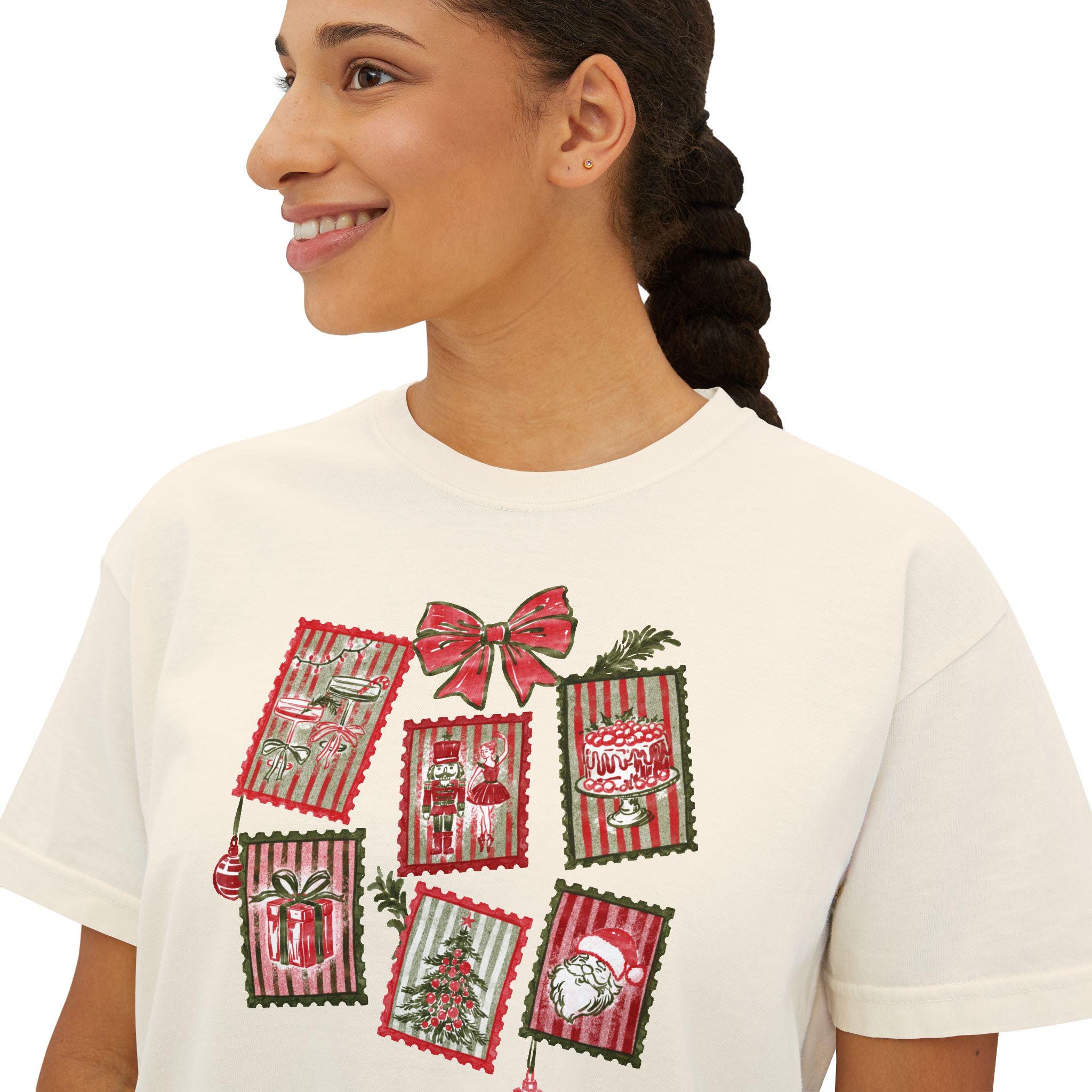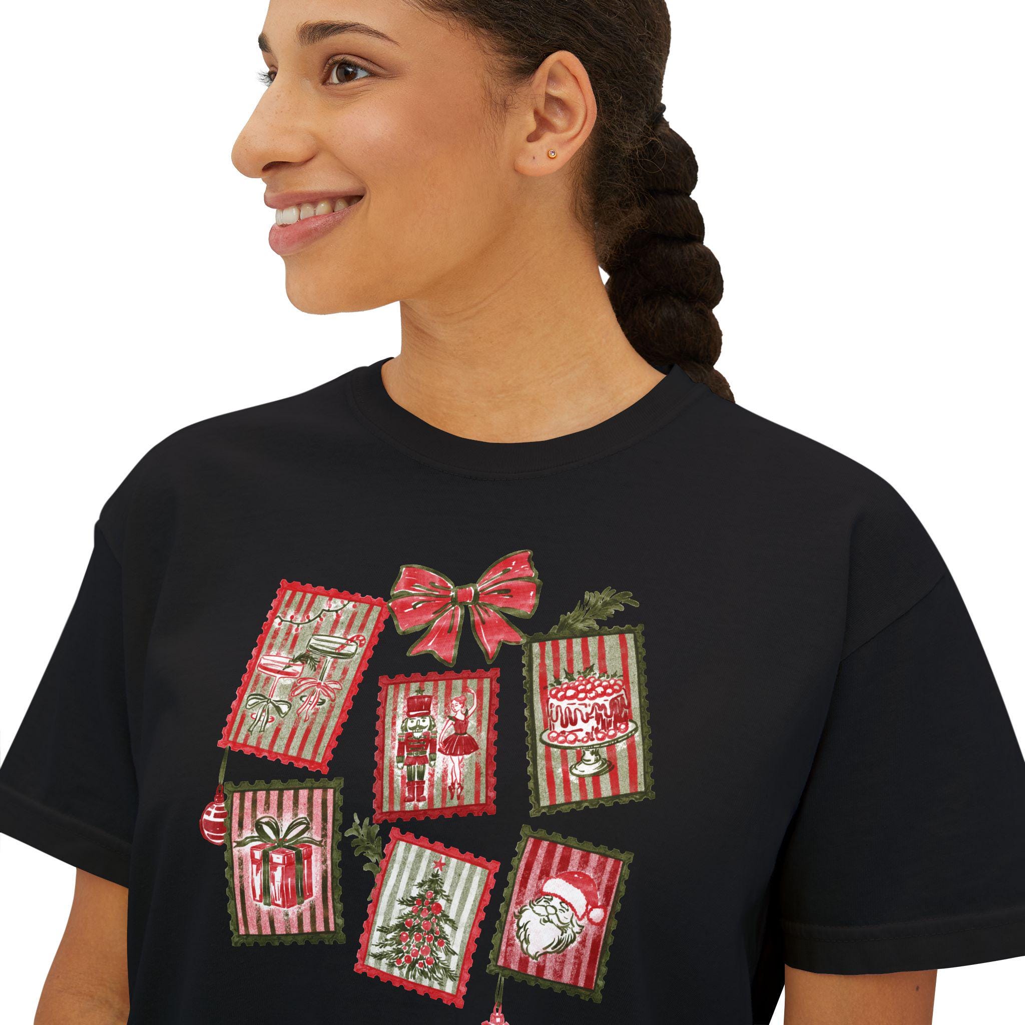 Retro Christmas stamps boxy tee, vintage holiday women's shirt, festive Xmas stamp design, cozy winter seasonal top