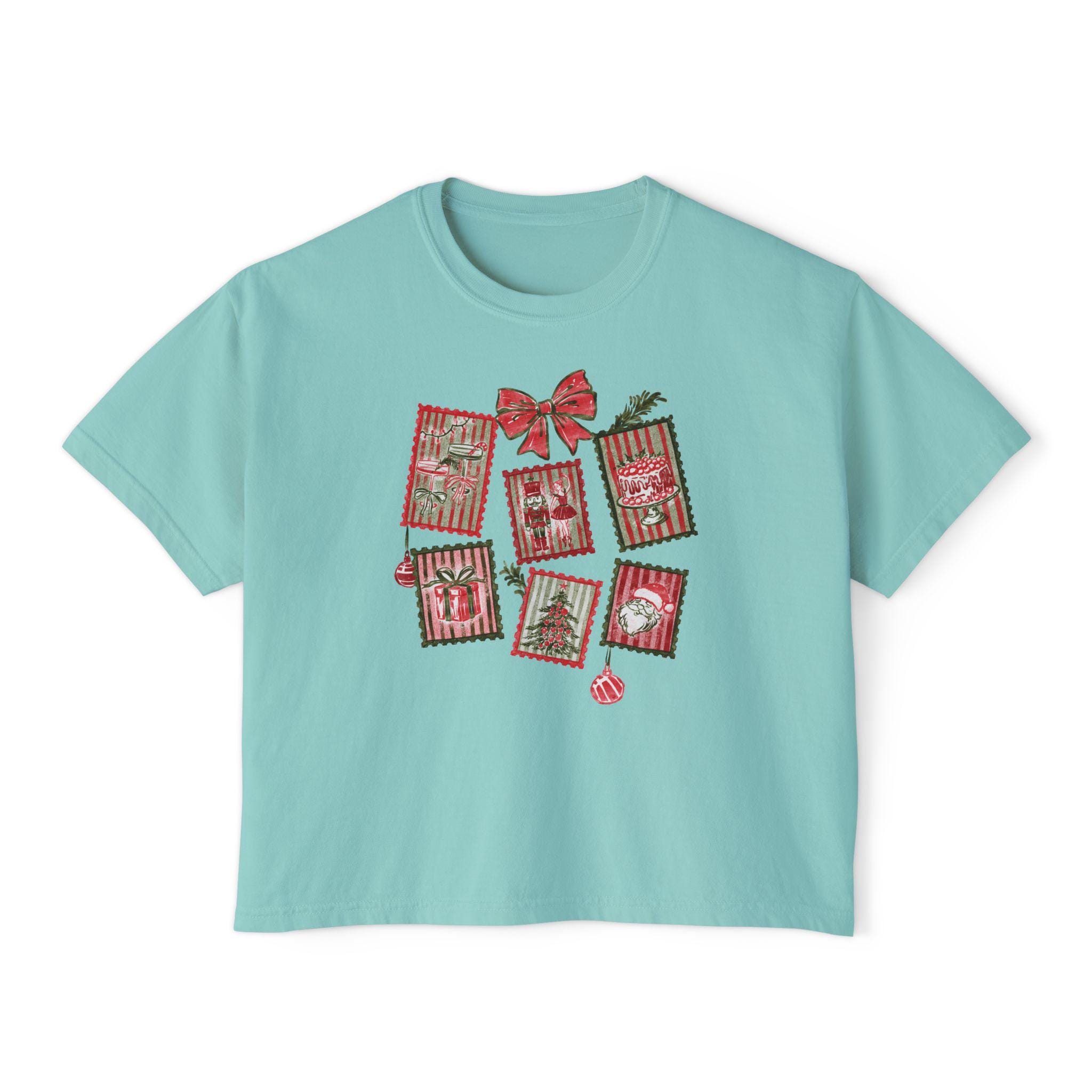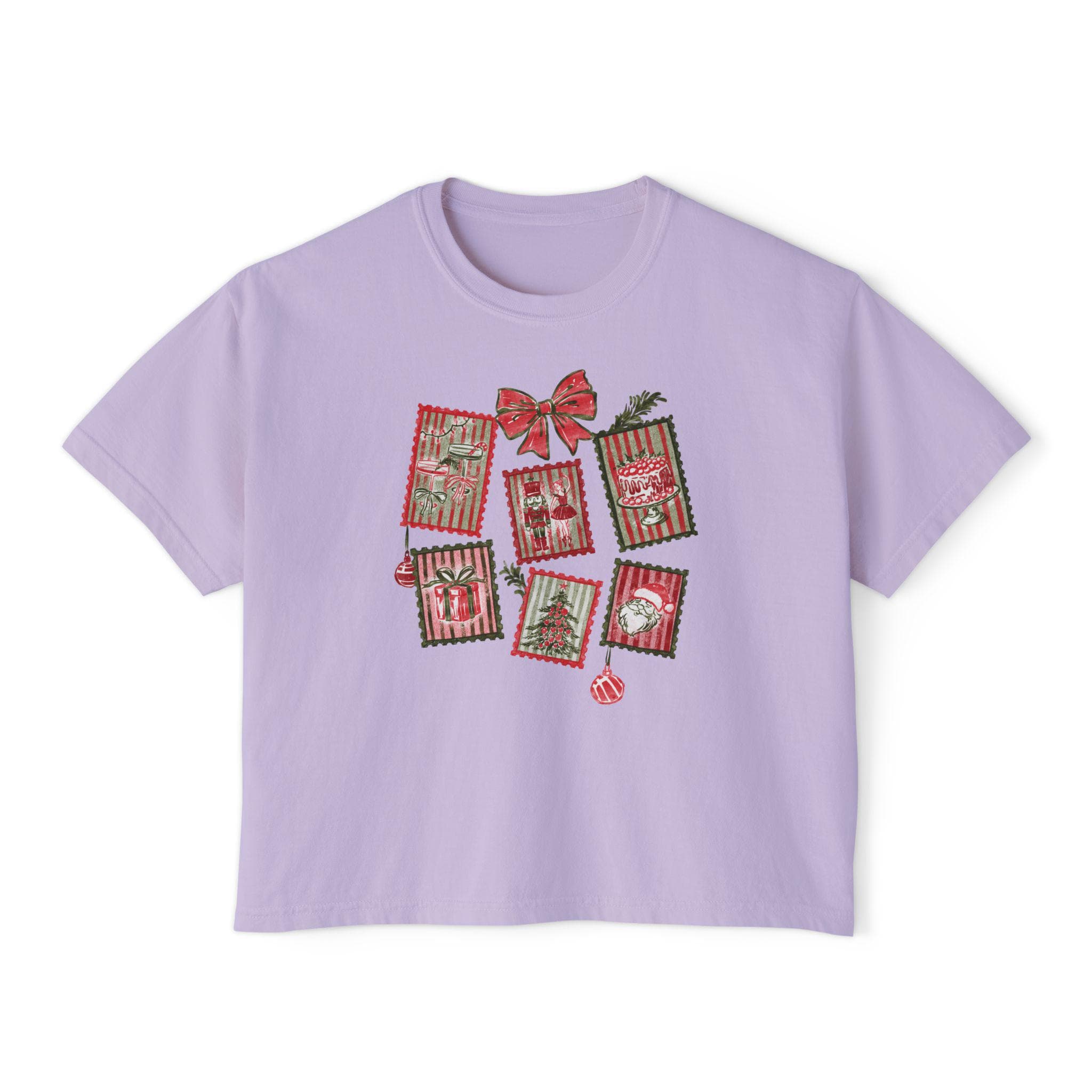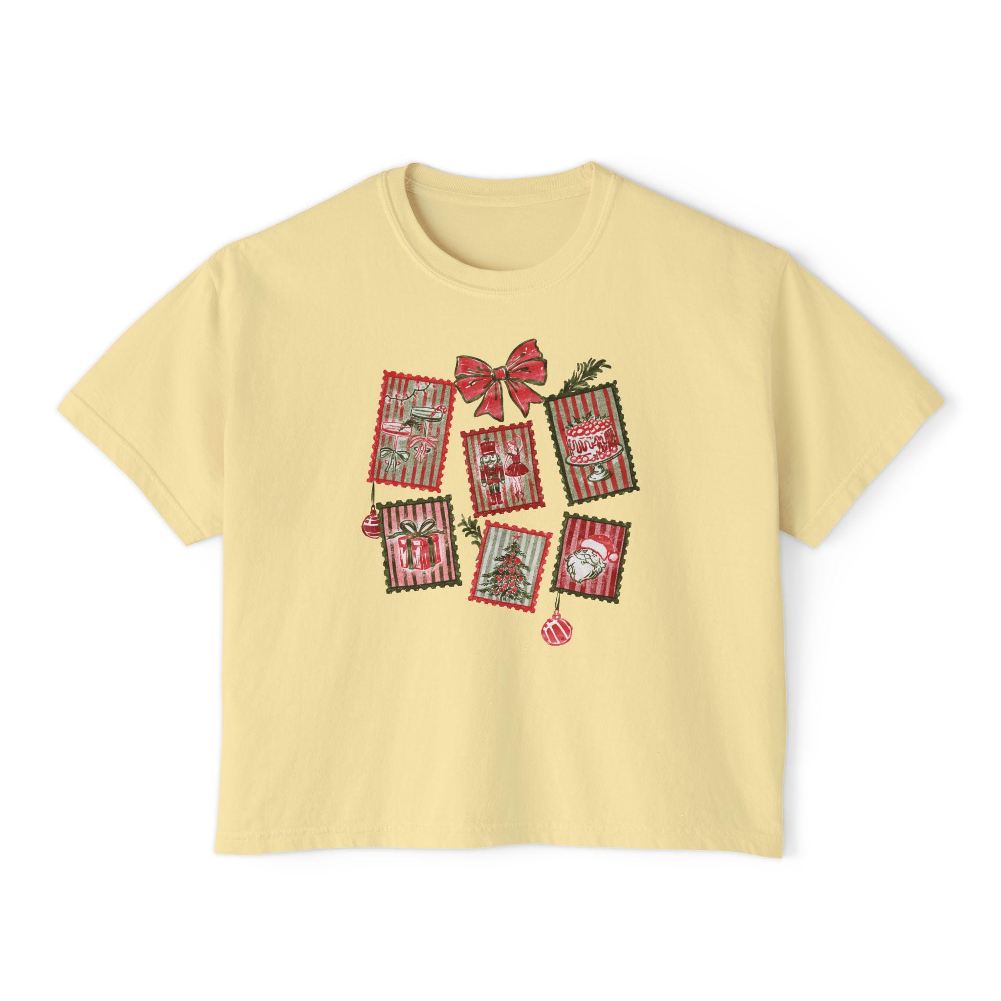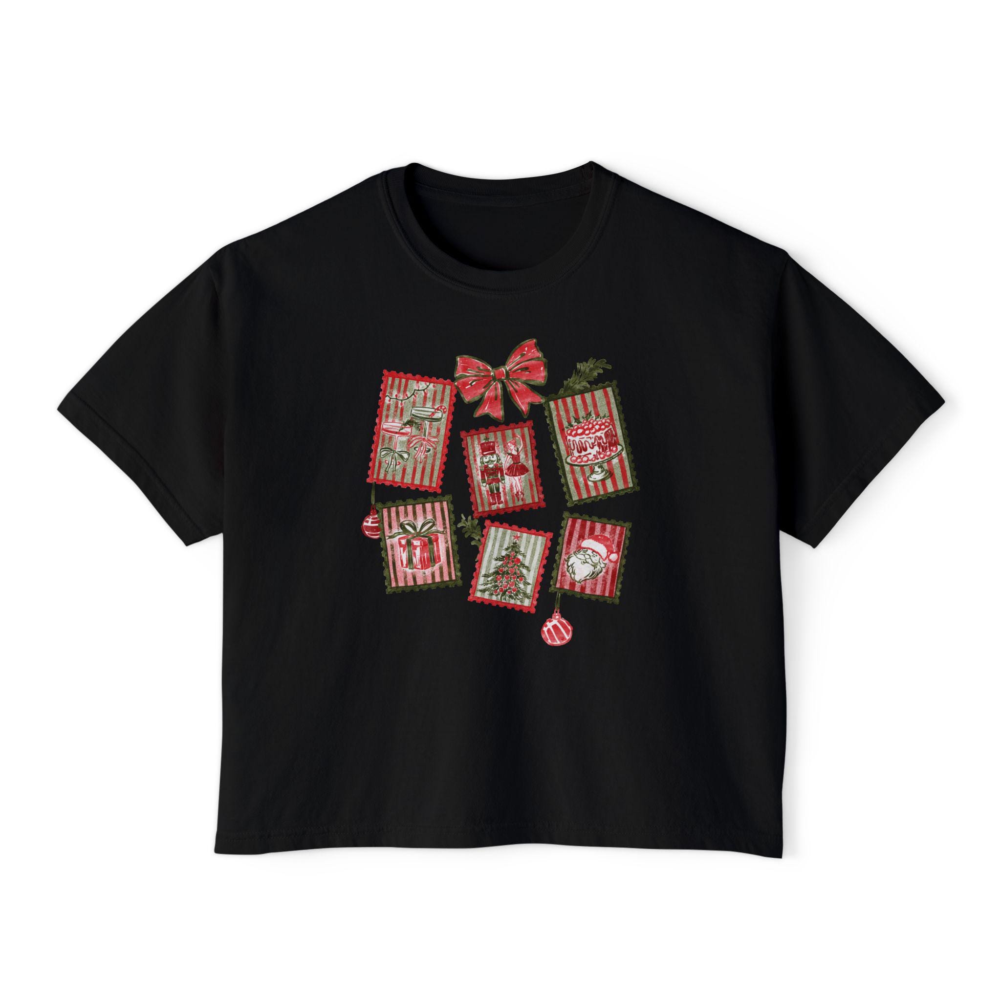 Retro Christmas stamps boxy tee, vintage holiday women's shirt, festive Xmas stamp design, cozy winter seasonal top